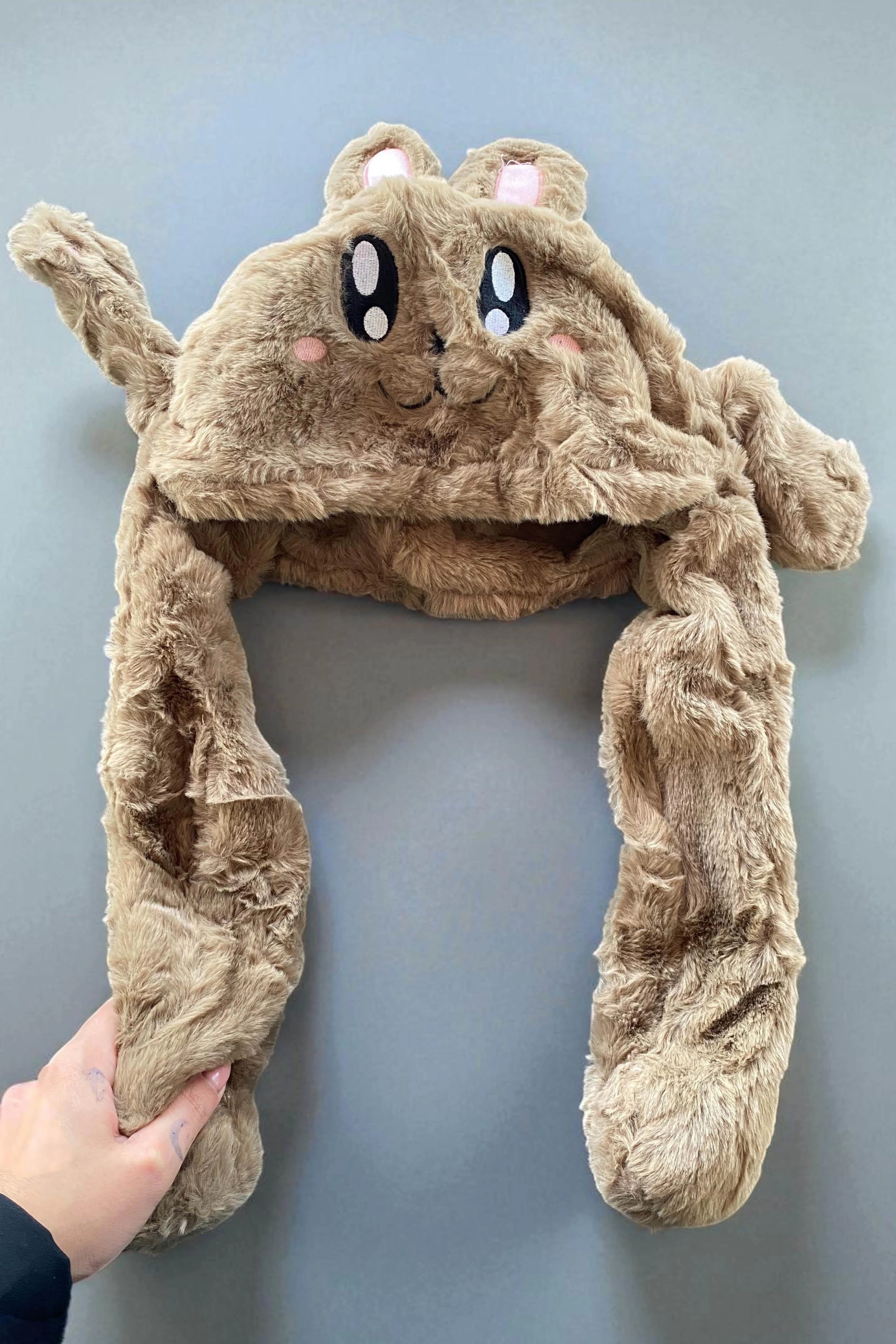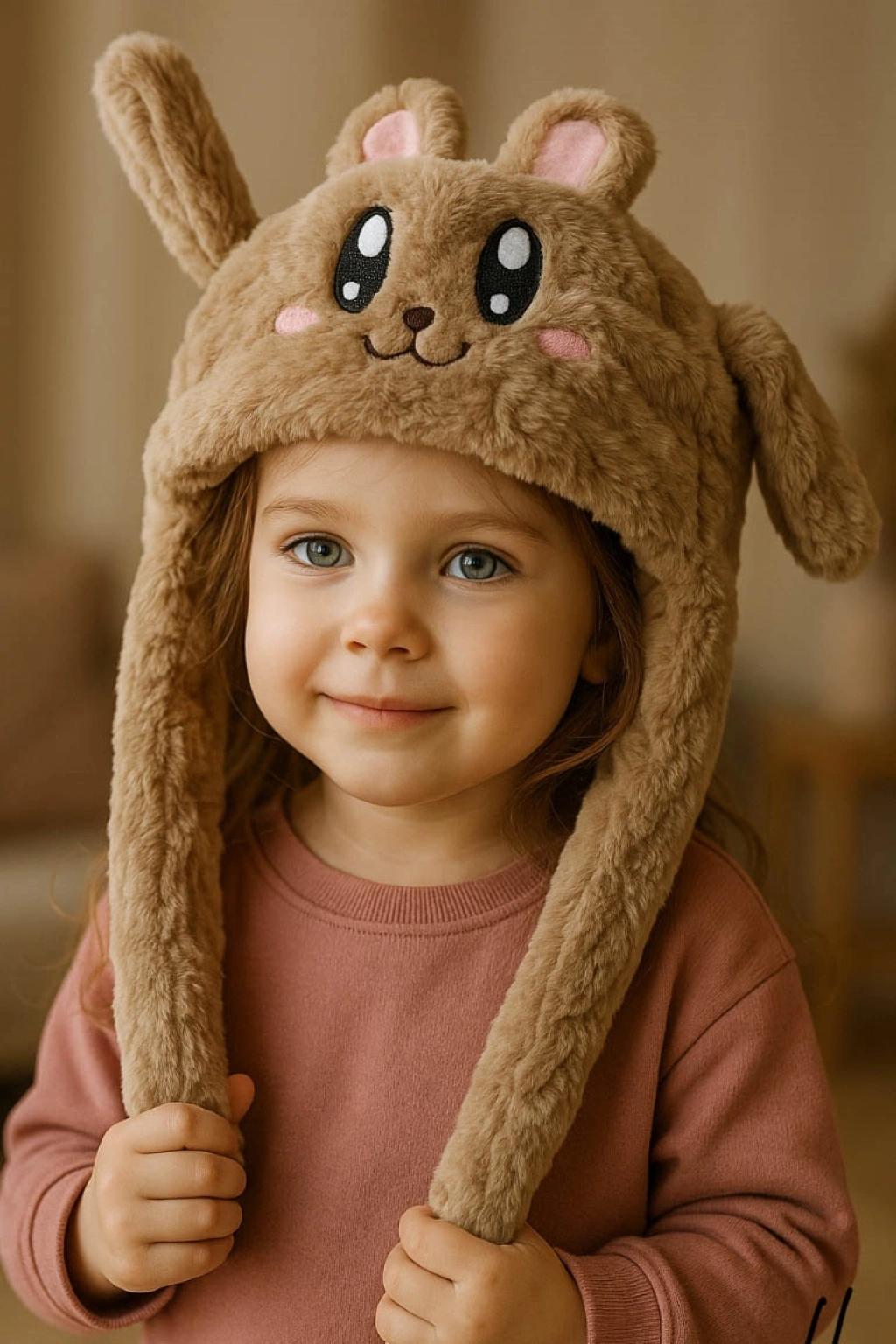 Kahverengi Tavşan Figürlü Kulakları Oynayan Peluş Şapka