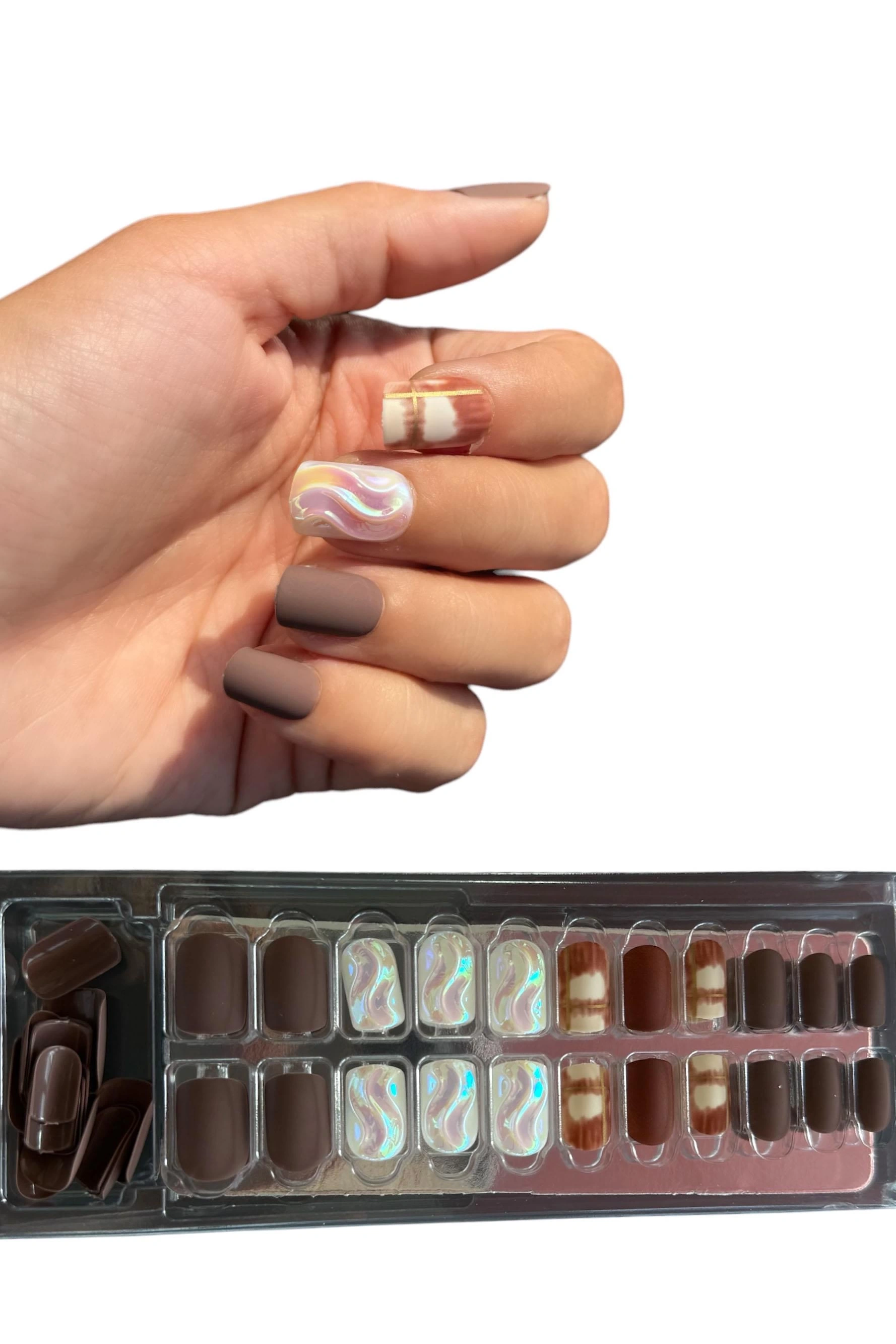 Zarif ve kendinden cilalı takma tırnaklar, etkileyici bir görünüm sağlar.