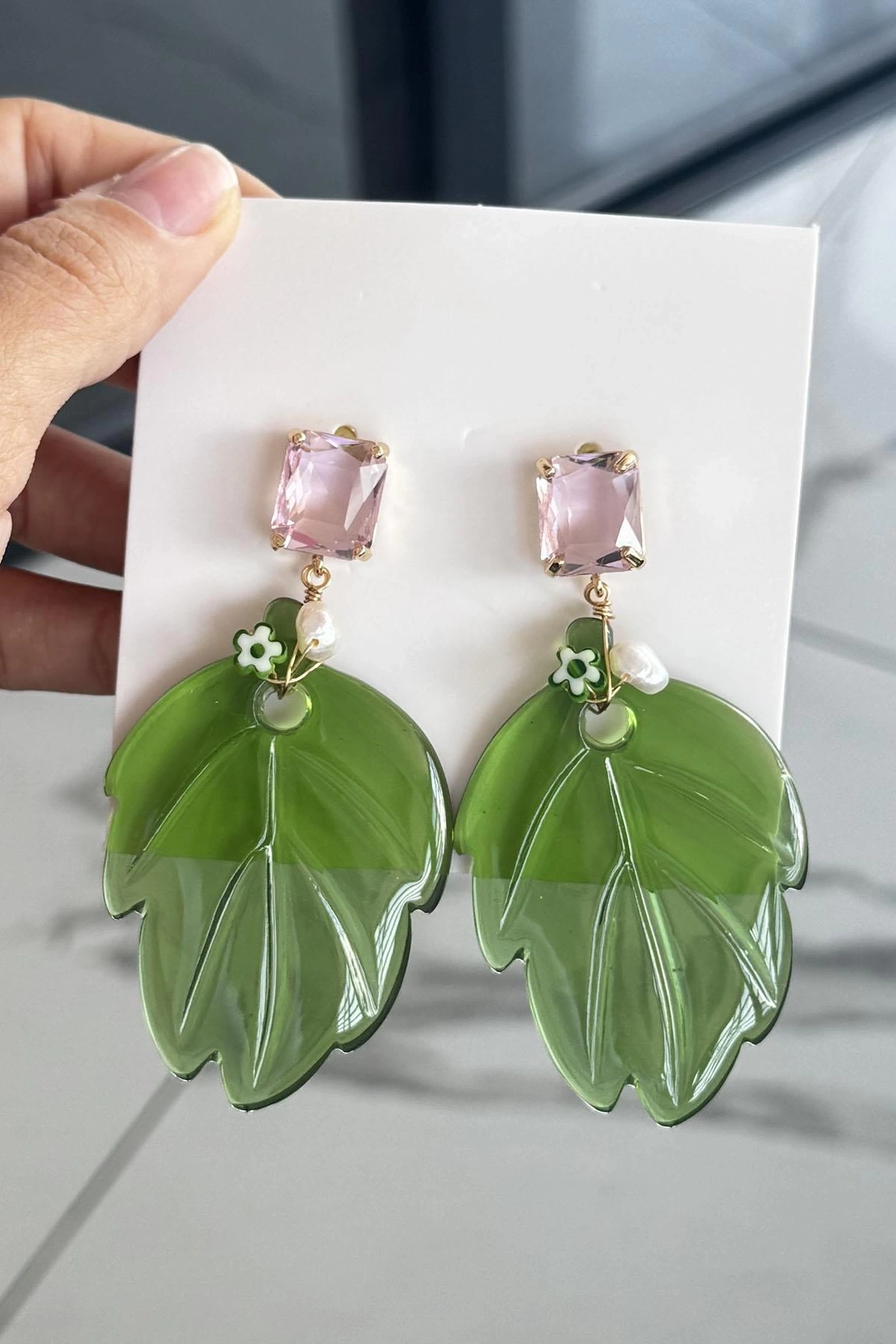 Karışık Renk Taş Detaylı Yaprak Figürlü Küpe (Çift)