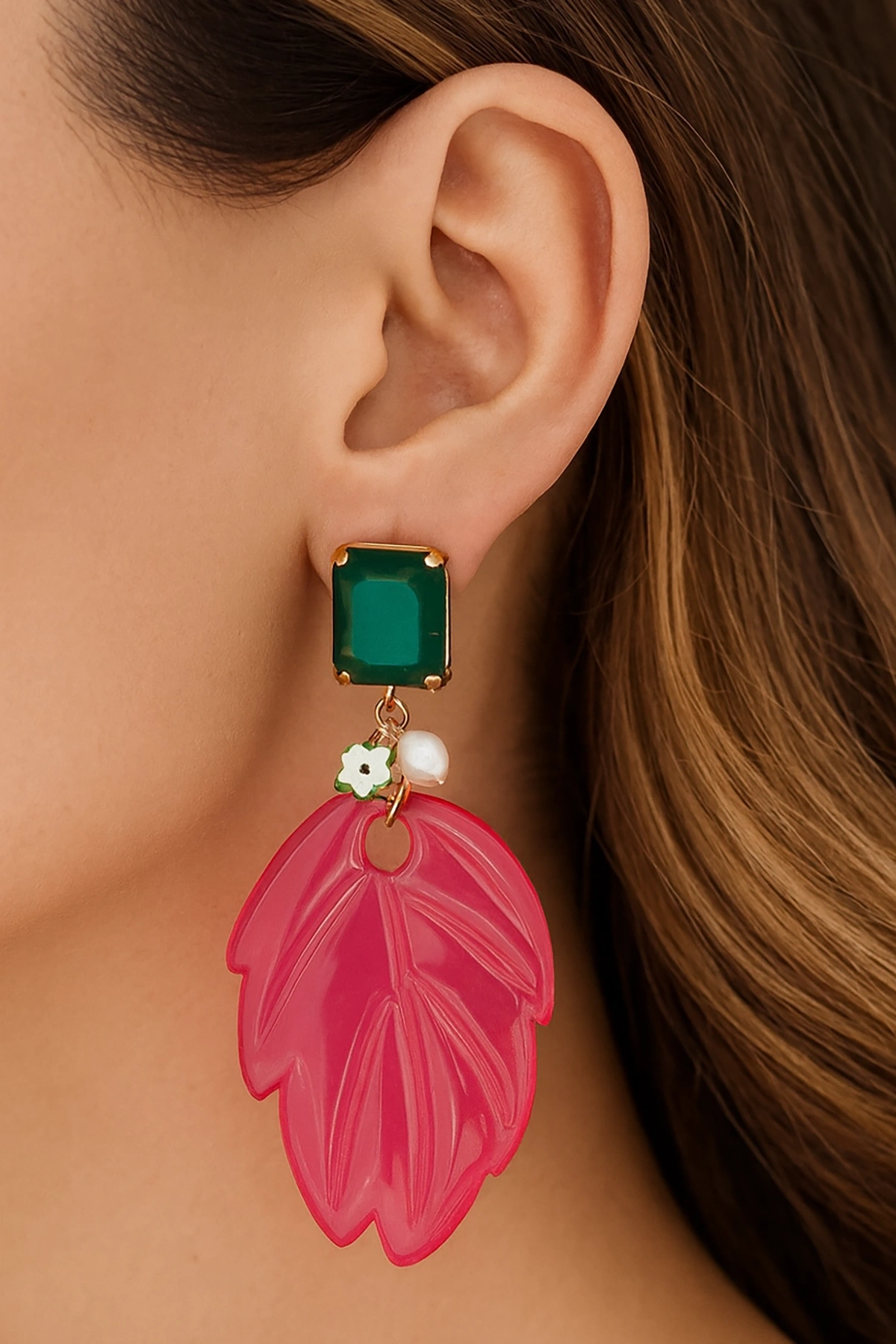 Karışık Renk Yaprak Figürlü Taş Detaylı Tasarım Küpe (Çift)