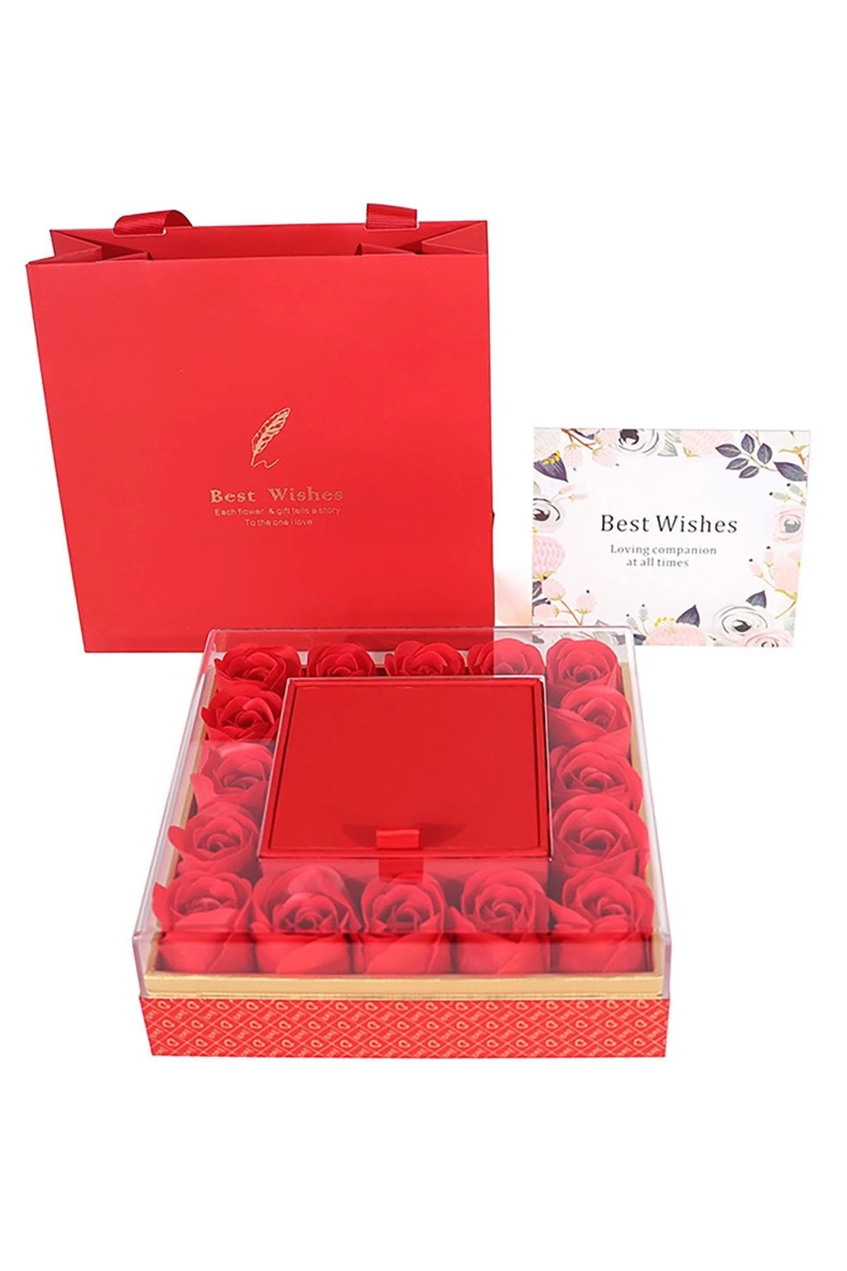 Aşkı ve zarafeti bir arada sunan bu özel hediye kutusu, sevdiklerinize unutulmaz bir sürpriz yapmak için tasarlandı. Kırmızı saten kurdeleyle süslenmiş kutunun kapağında kalp şeklinde pencere ve altın yaldızlı yazı detayları bulunur. İç kısmında yapay güller ve takı yerleştirilebilecek özel bir bölme yer almaktadır. Kutunun sağ bölümünde 9 adet canlı kırmızı yapay gül yer alırken, sol kısmı kolye, bileklik veya yüzük gibi takılar için ayrılmıştır.