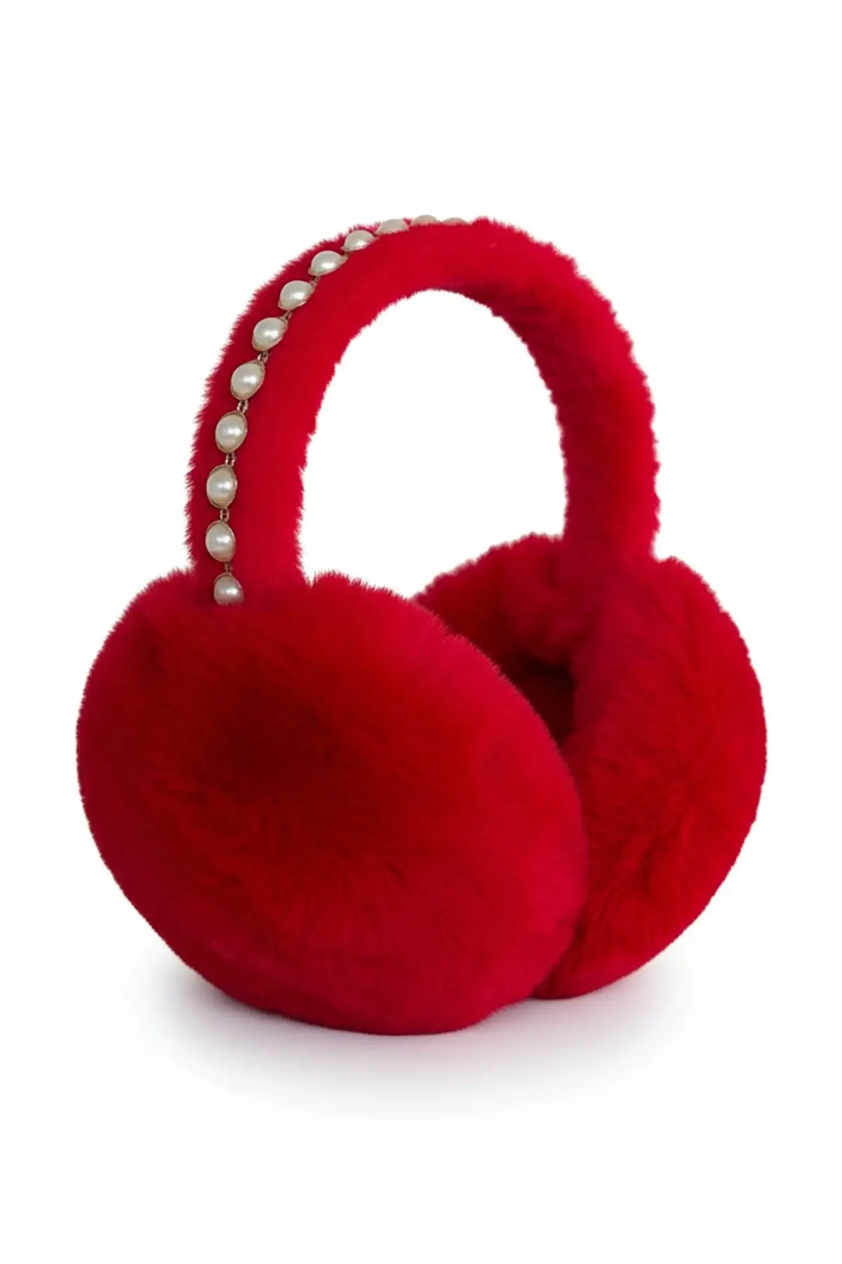 Kırmızı Renk İnci Detaylı Peluş Kulaklık