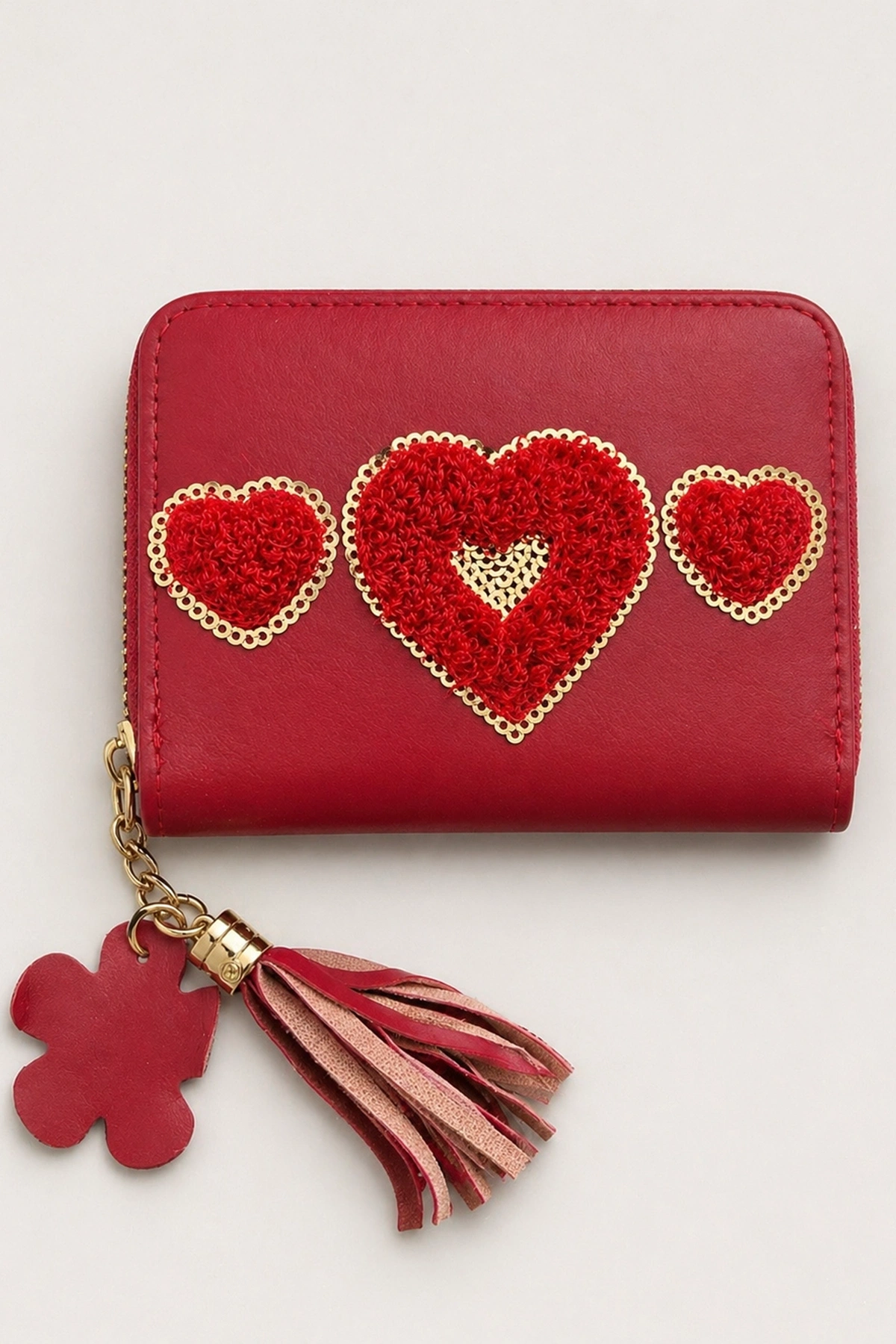Kırmızı Renk Kalp Figürlü Deri Kadın Cüzdan