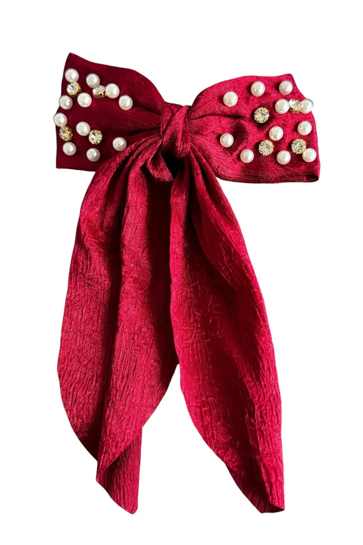 Bordo Renk İnci Ve Taş Detaylı Otomat Toka