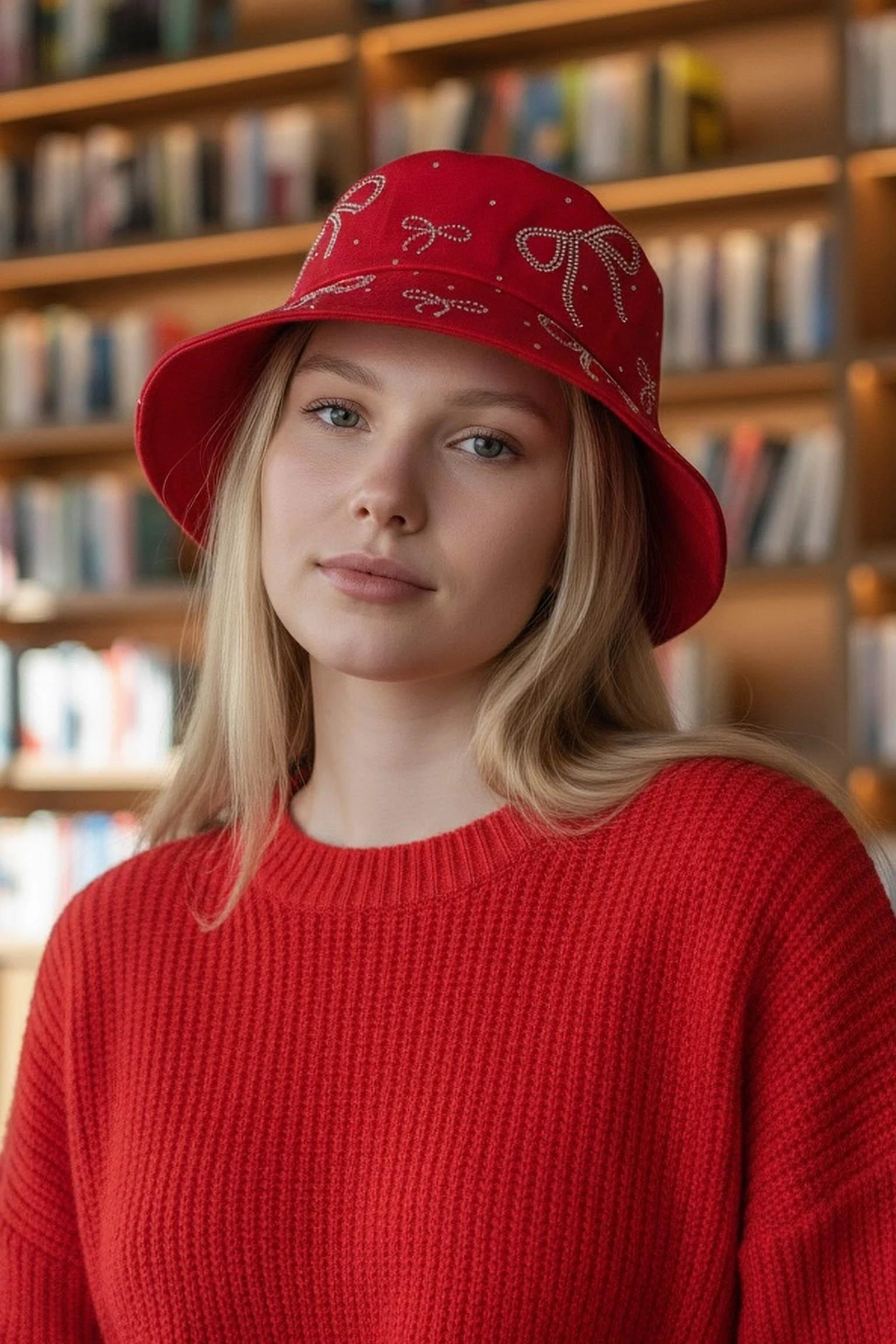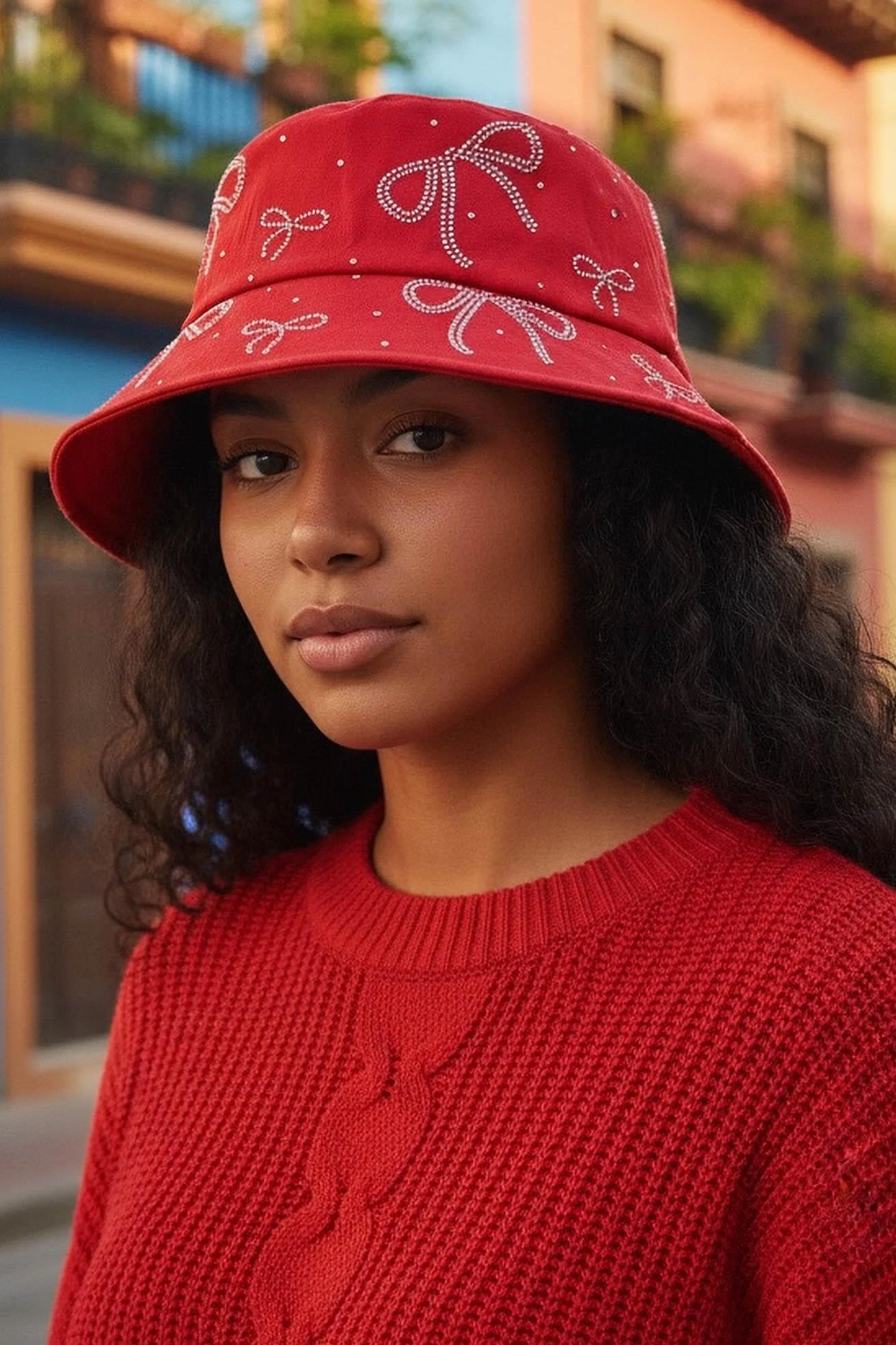 Kırmızı Renk Kurdele Figürlü Taş Detaylı Tasarım Şapka
