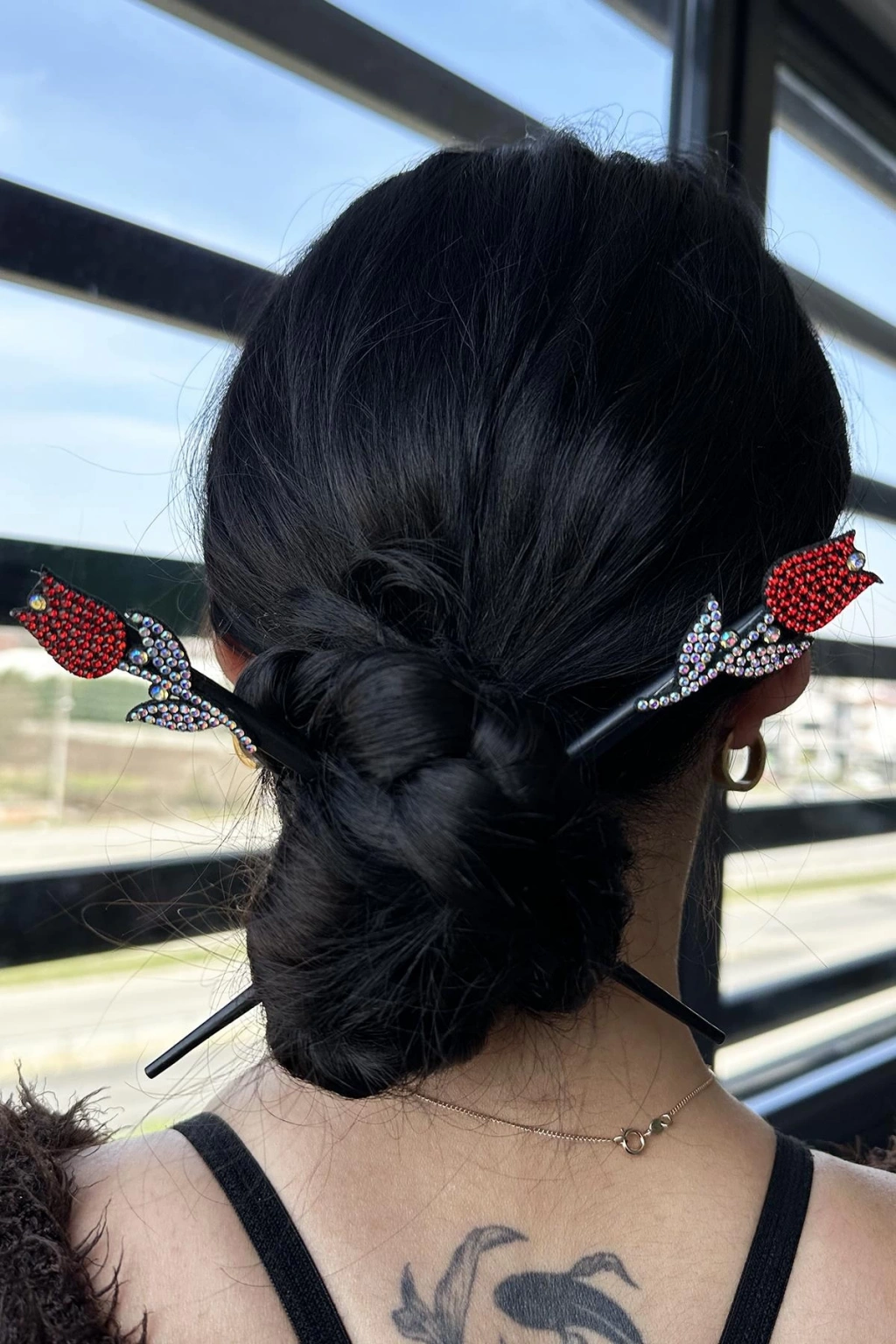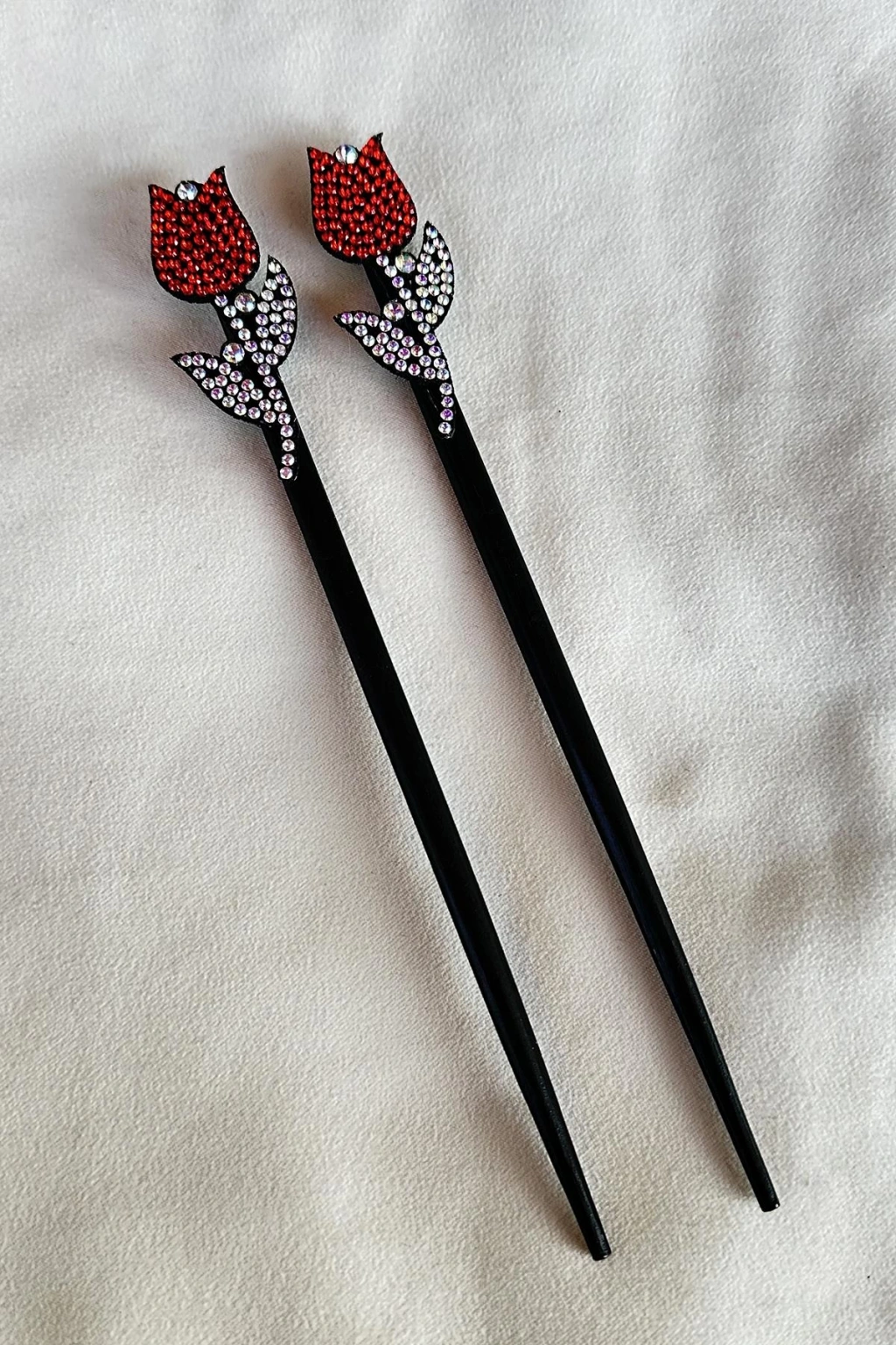 Kırmızı Renk Lale Figürlü Taş Detaylı Topuz Tokası/ Kalemi