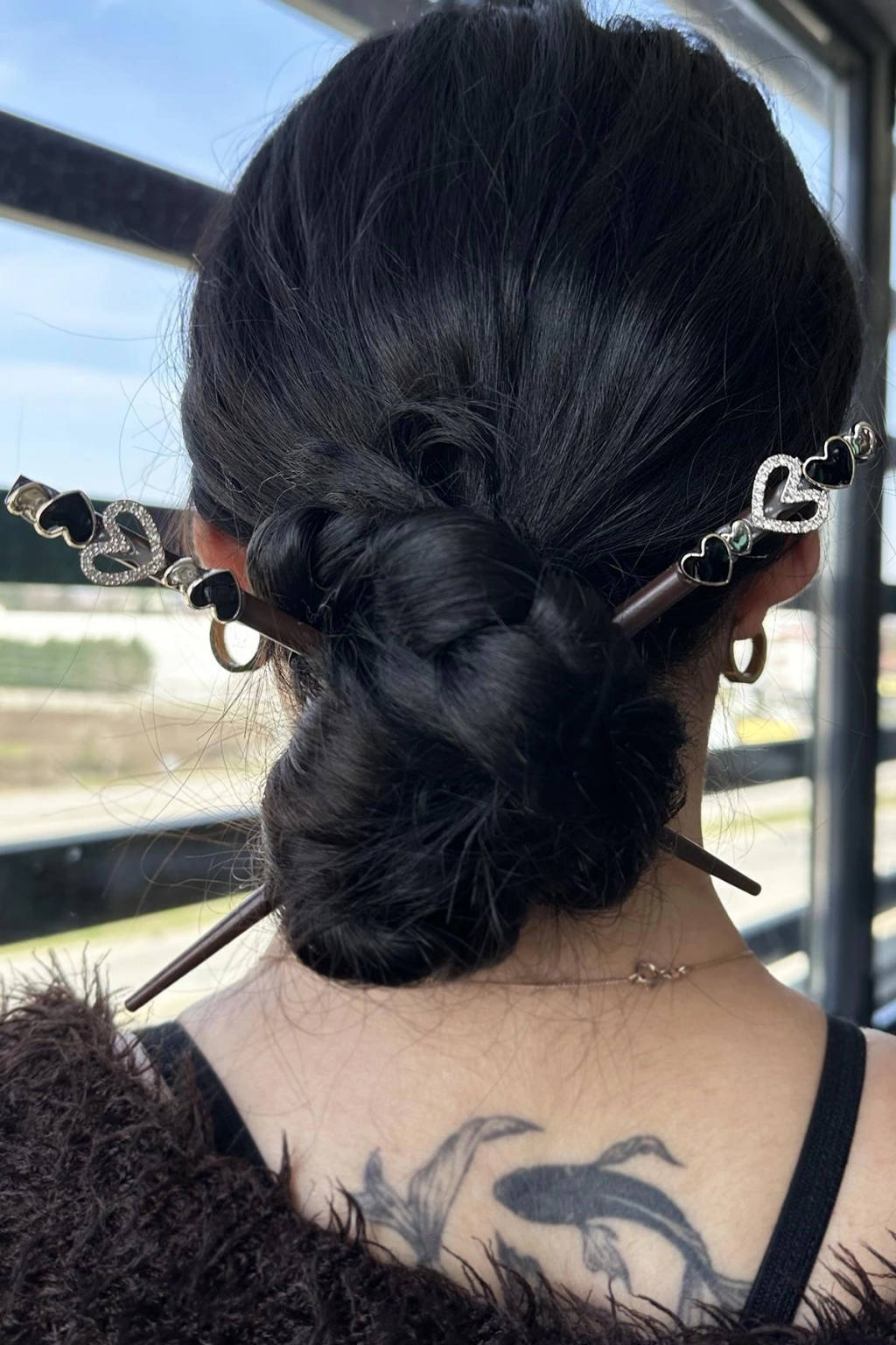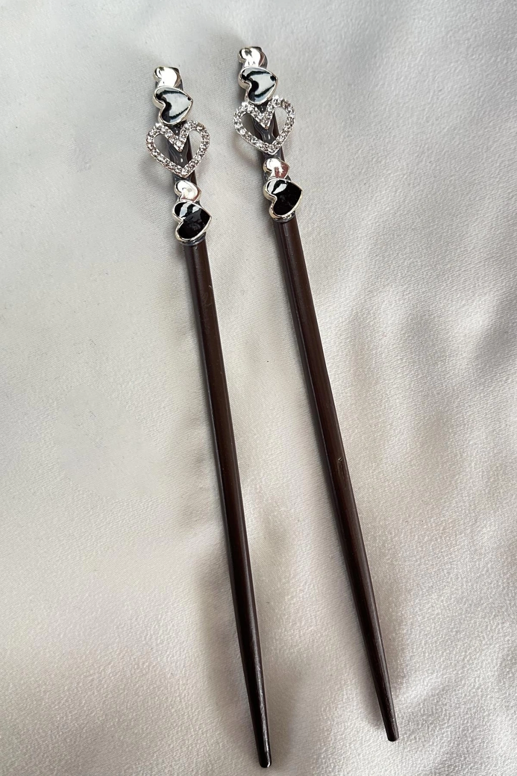 Koyu Kahve Renk Kalp Figürlü İkili Topuz Tokası/ Kalemi