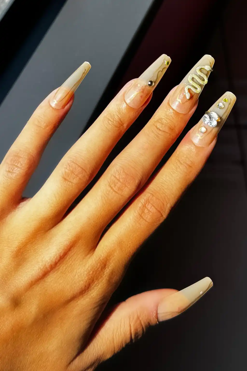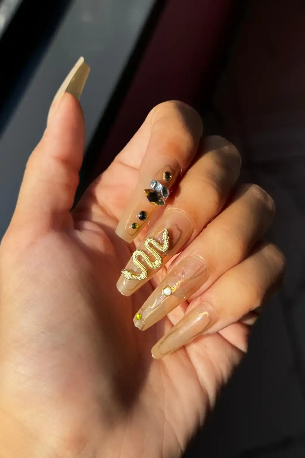 Zarif ve kendinden cilalı takma tırnaklar, etkileyici bir görünüm sağlar.