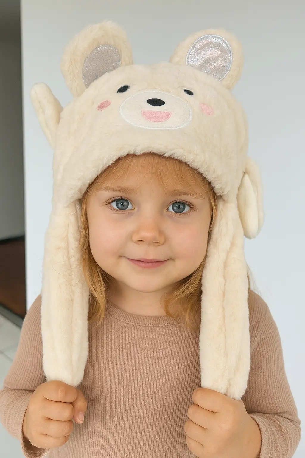 Krem Renk Ayıcık Figürlü Kulakları Oynayan Peluş Şapka