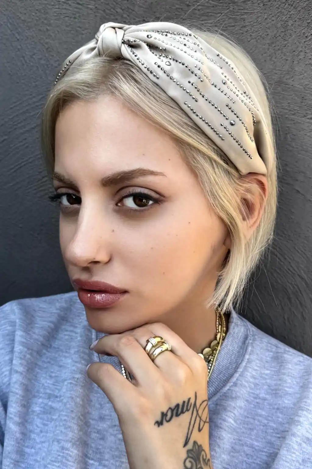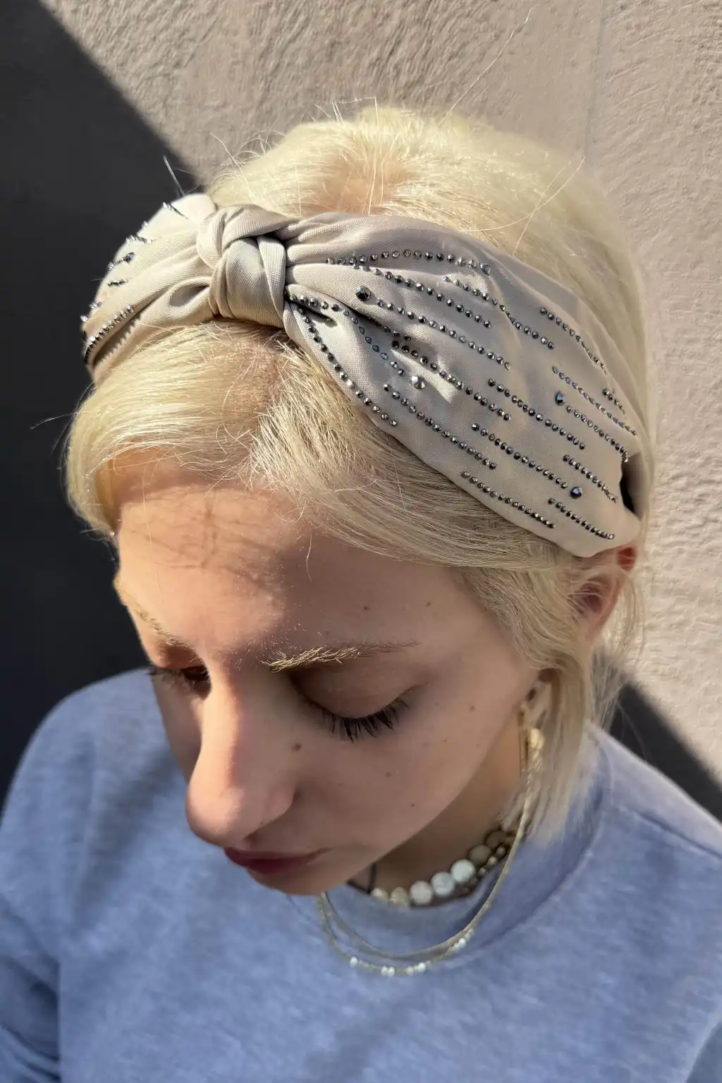 Krem Renk Düğüm Detaylı Taşlı Taç