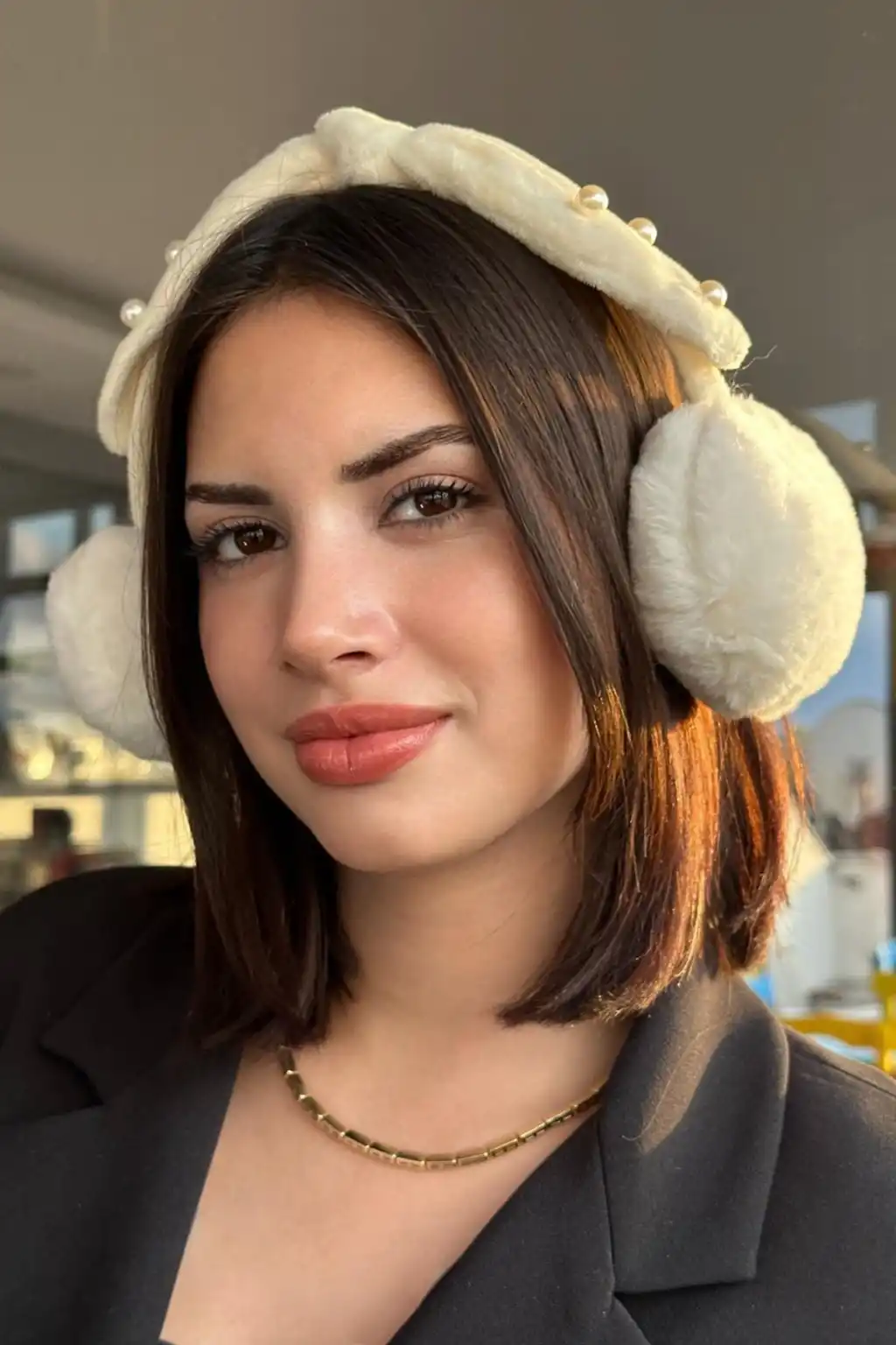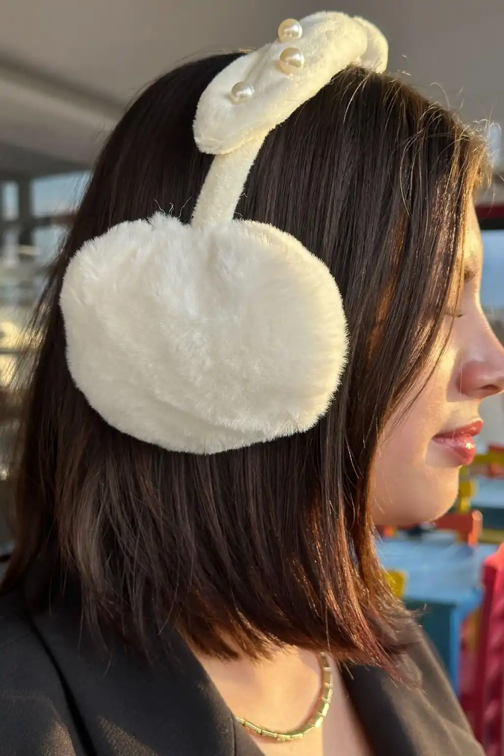 Krem Renk İnci Detaylı Kulaklı Çocuk Peluş Kulaklık