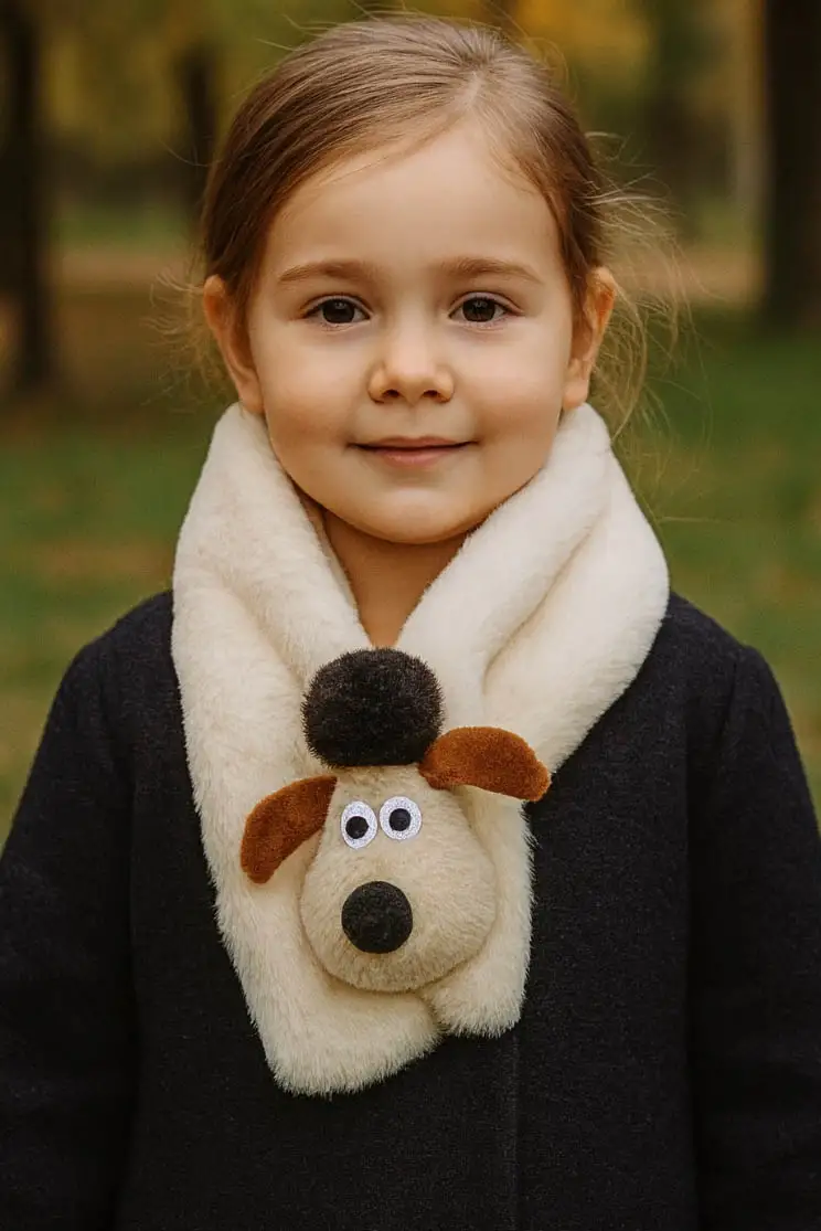 Krem Renk Köpek Figürlü Çocuk Peluş Atkı