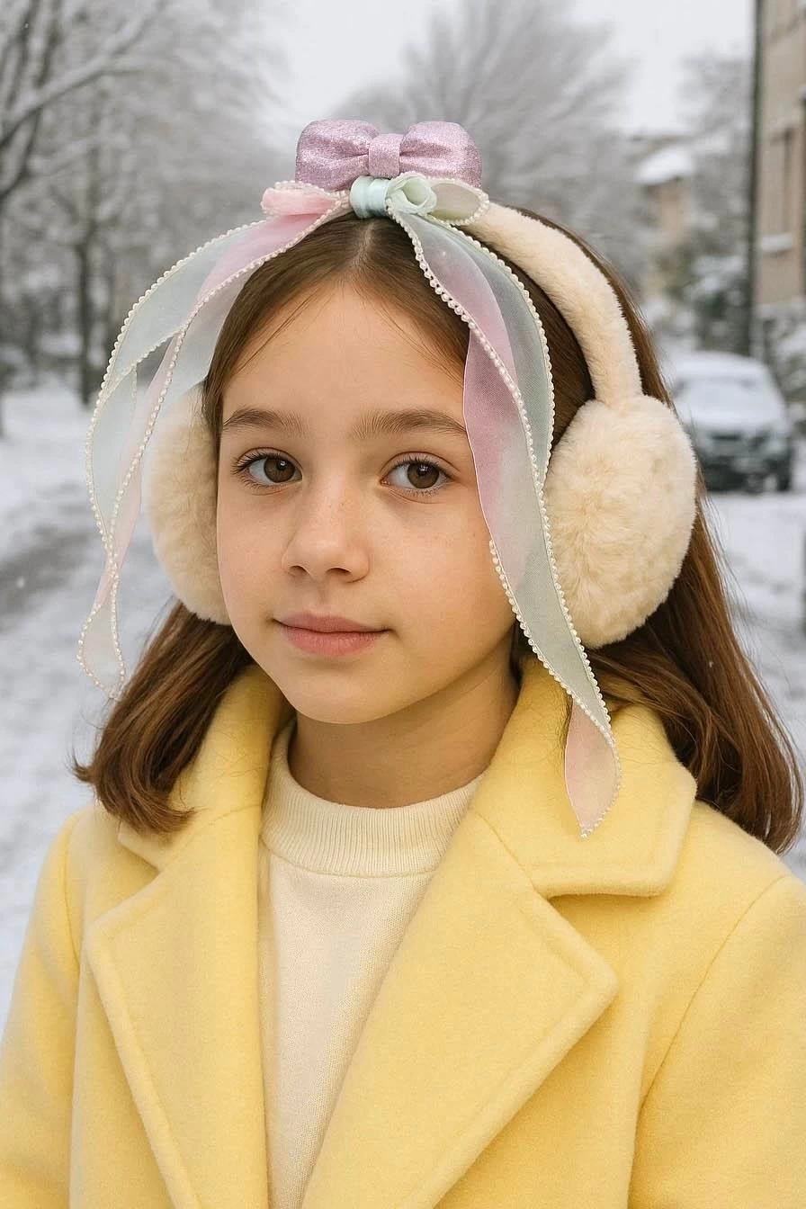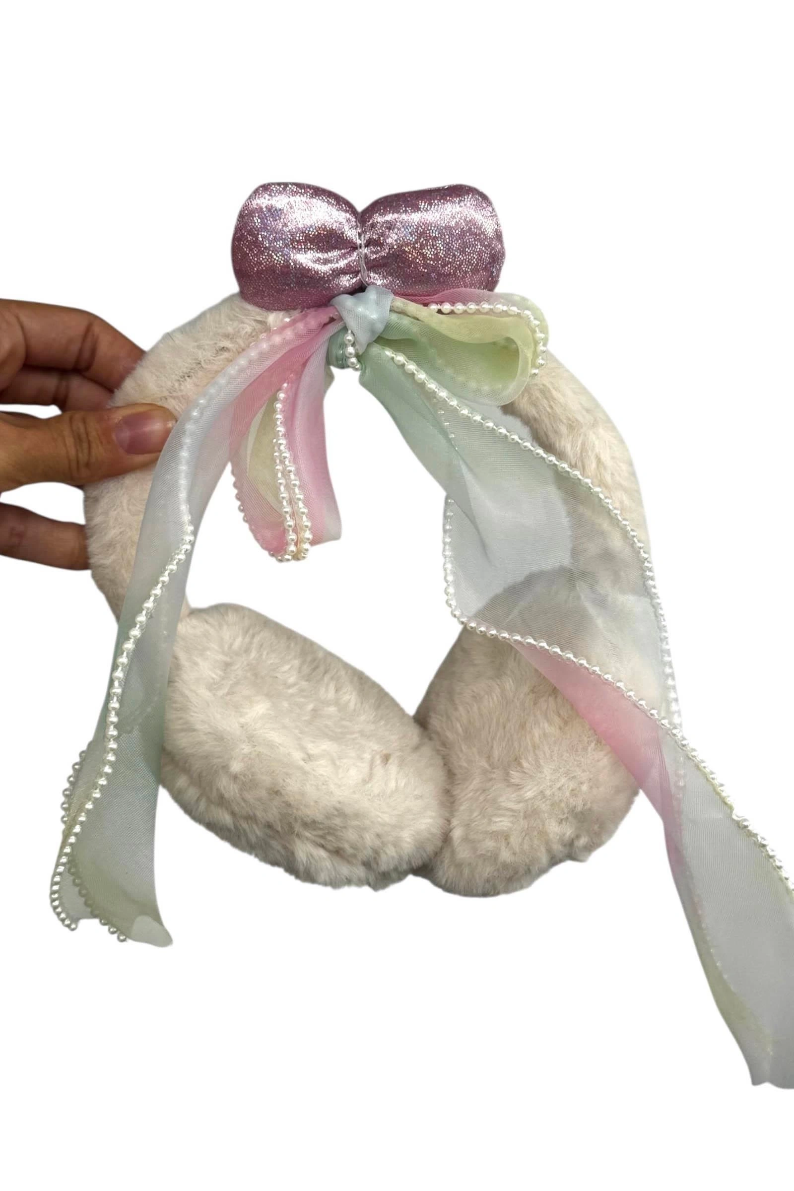 Krem Renk Kurdele Figürlü Peluş Kulaklık