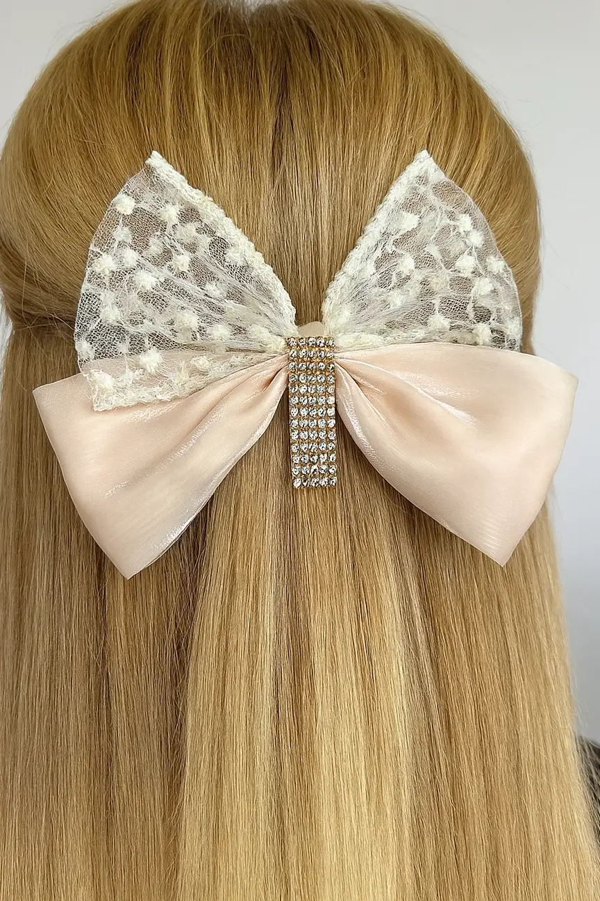 Bej Renk Kurdele Figürlü İnci Detaylı Otomat Toka