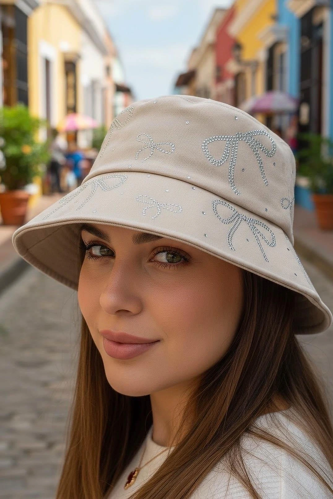 Krem Renk Kurdele Figürlü Taş Detaylı Tasarım Şapka