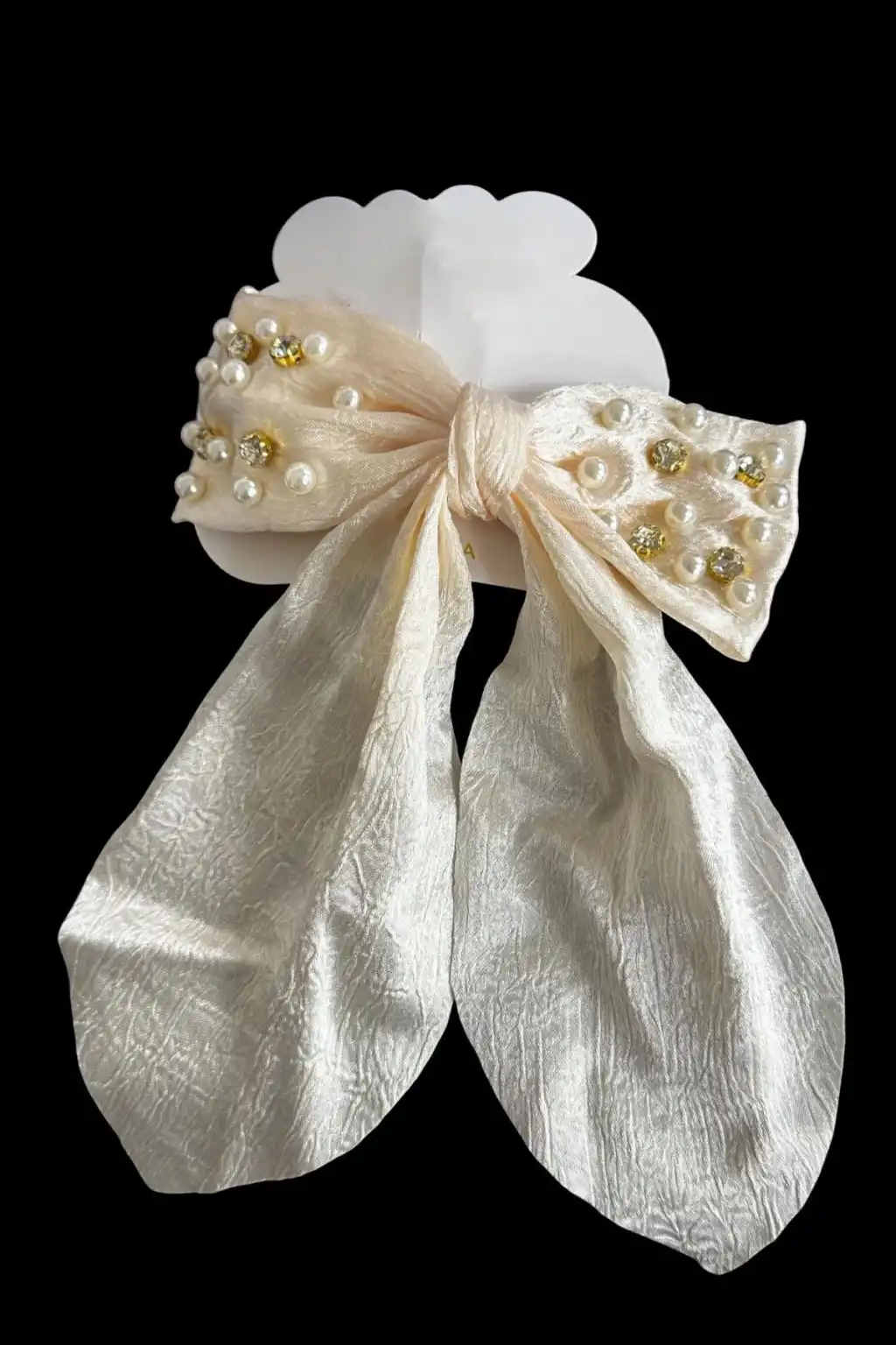 Krem Renk Kurdele Figürlü Taş Ve İnci Detaylı Otomat Toka