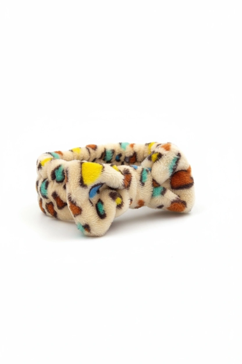 Krem Renk Leopar Figürlü Peluş Saç Bandı