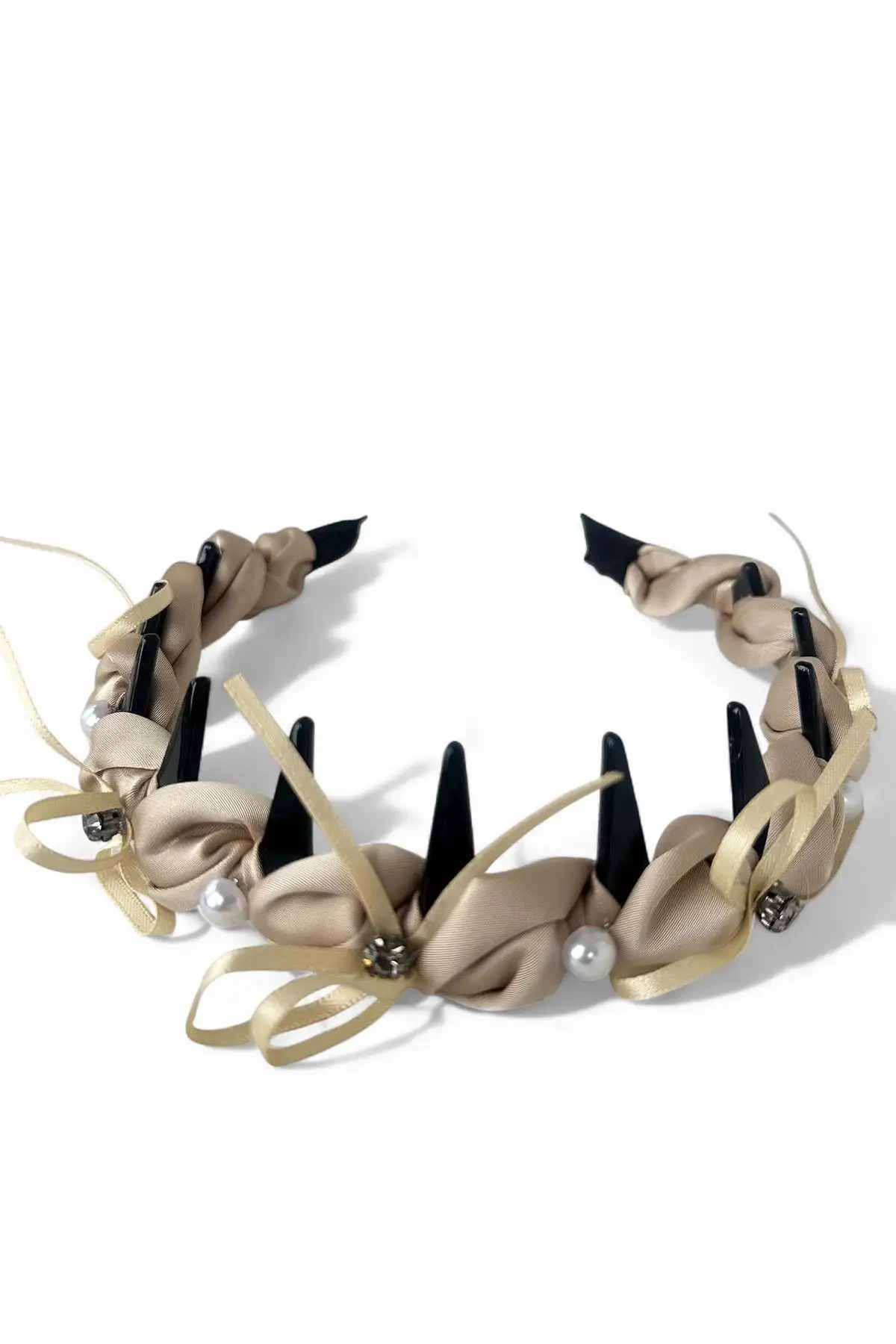 Krem Renk Kurdele Figürlü Taş Detaylı Taç