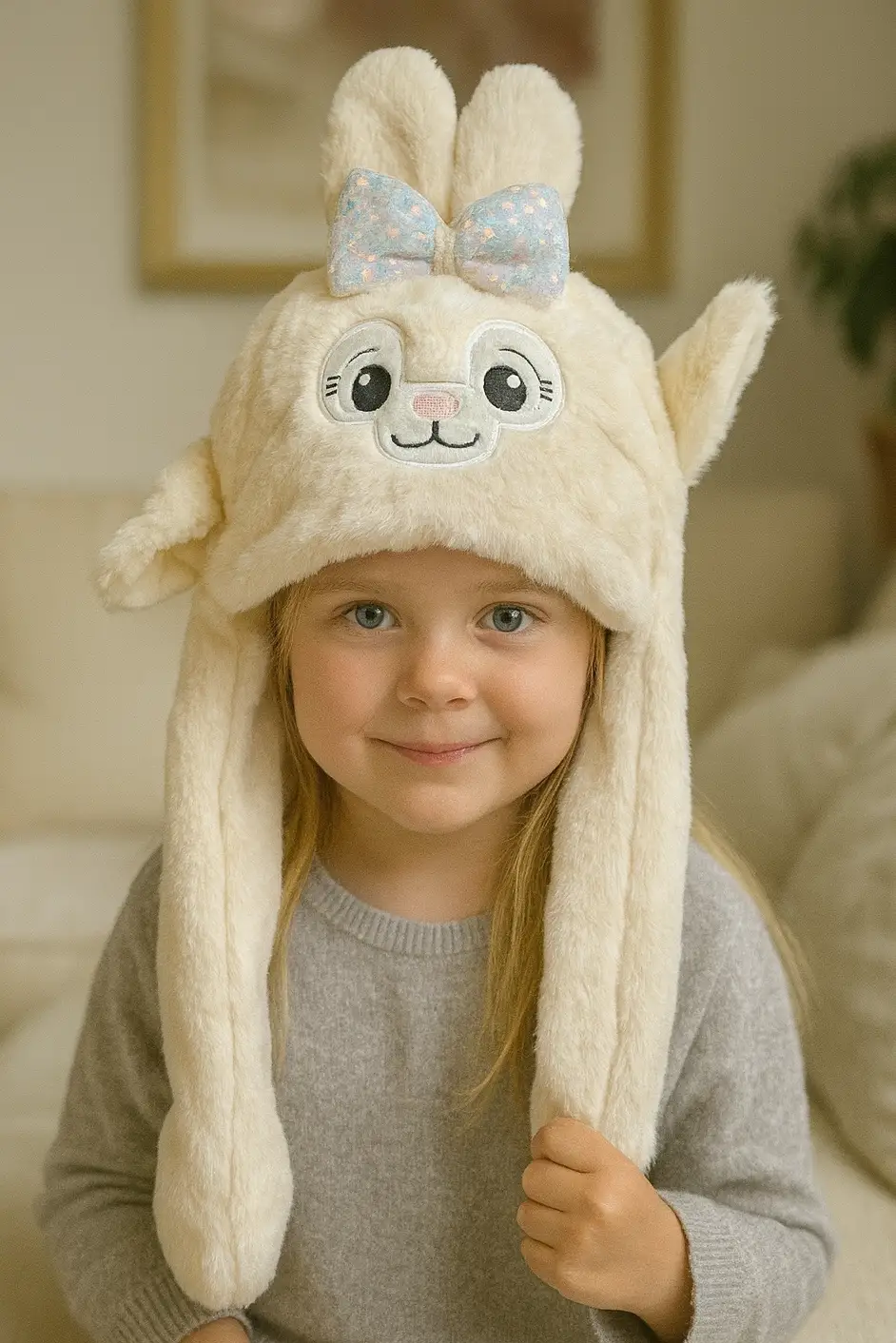 Krem Renk Tavşan Figürlü Kulakları Oynayan Peluş Şapka