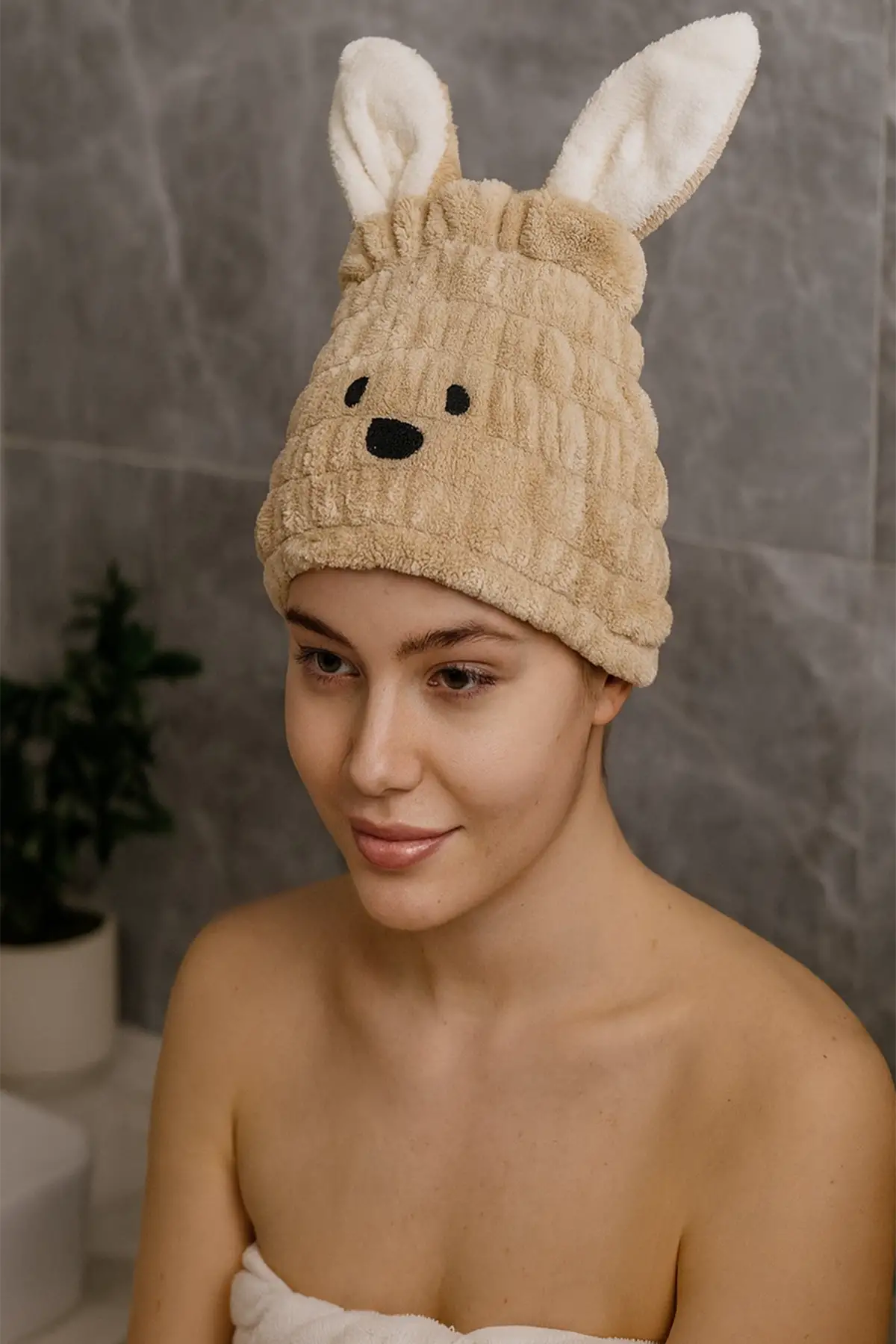 Krem Renk Tavşan Figürlü Saç Havlusu/ Bonesi Lastikli