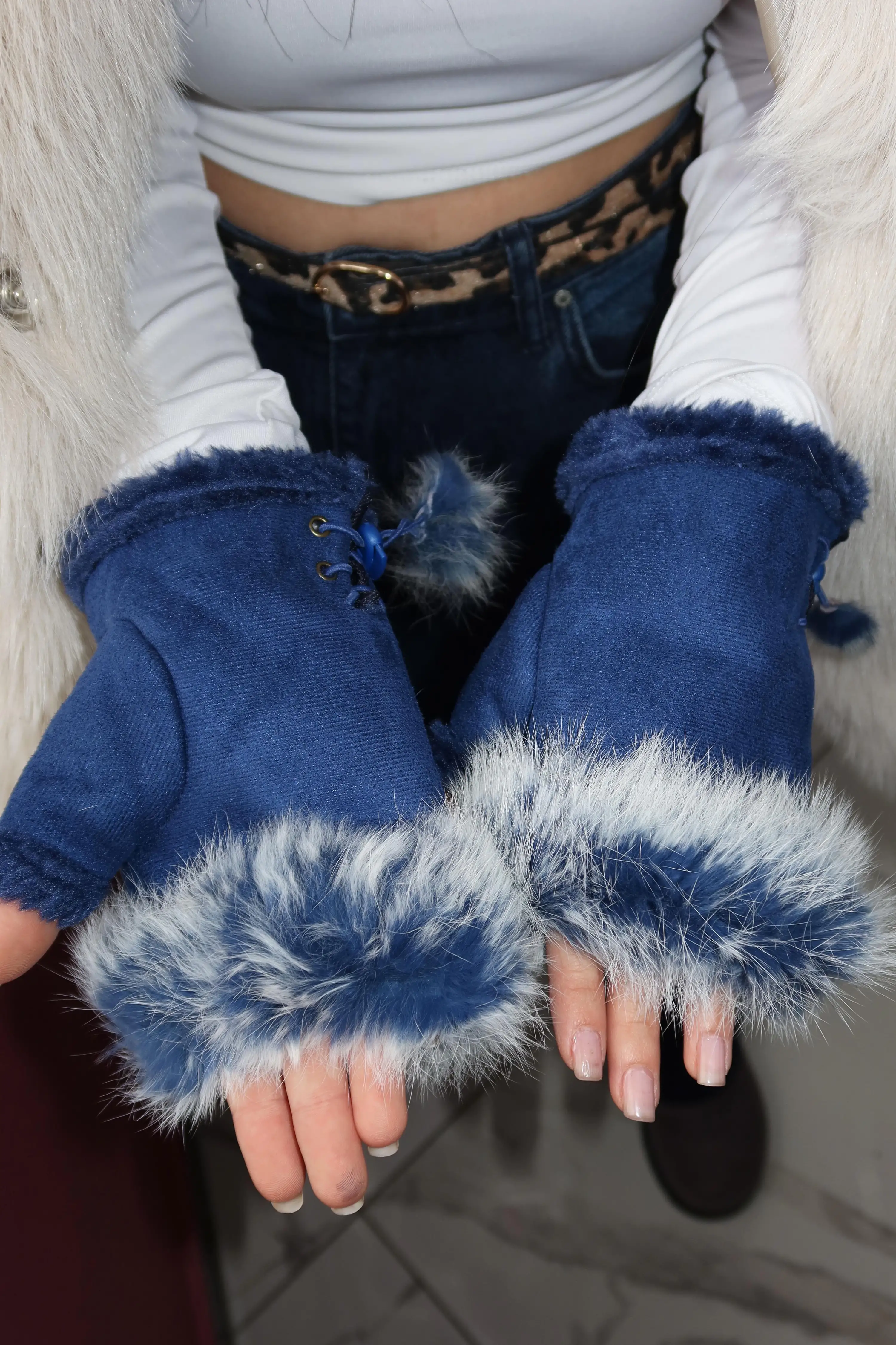 Lacivert Renk Peluş Detaylı Kesik Eldiven