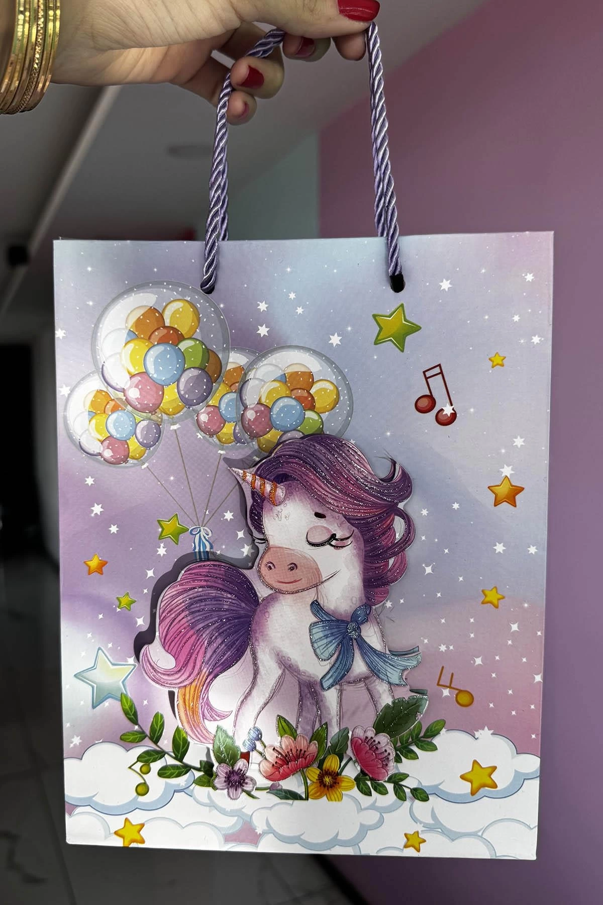 Lila Renk Unicorn Figürlü 3D Görünümlü Karton Çanta