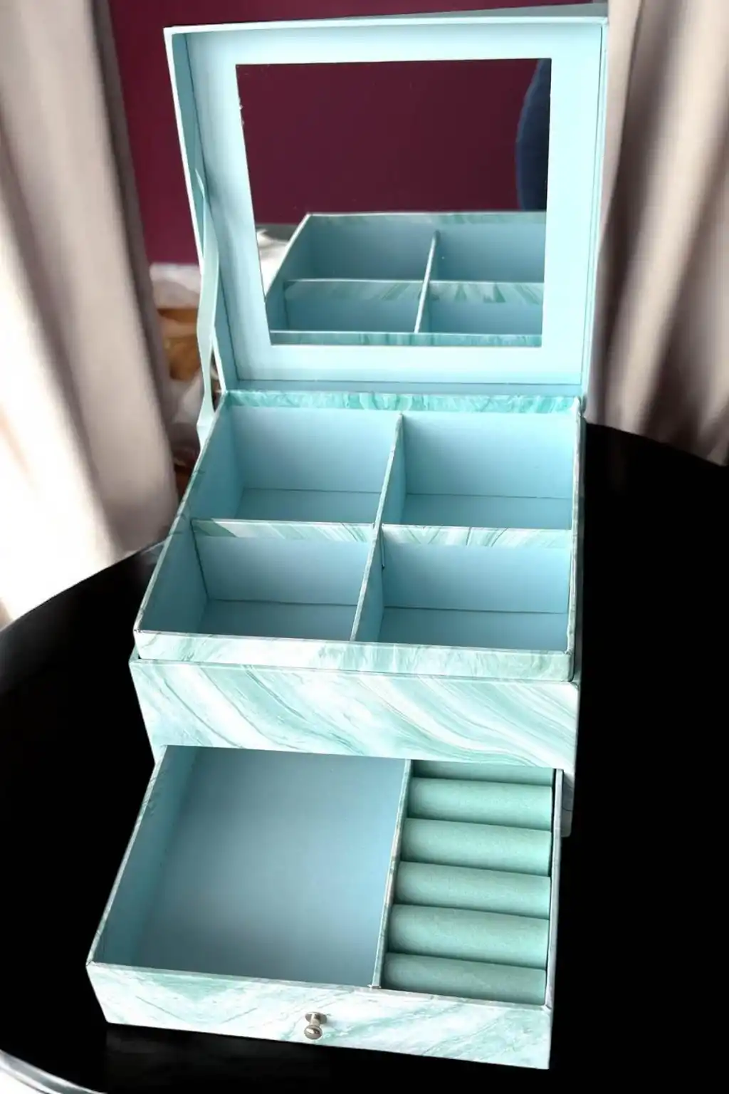 Mavi Renk Ayna Detaylı Bölmeli Çekmeceli Takı Organizeri