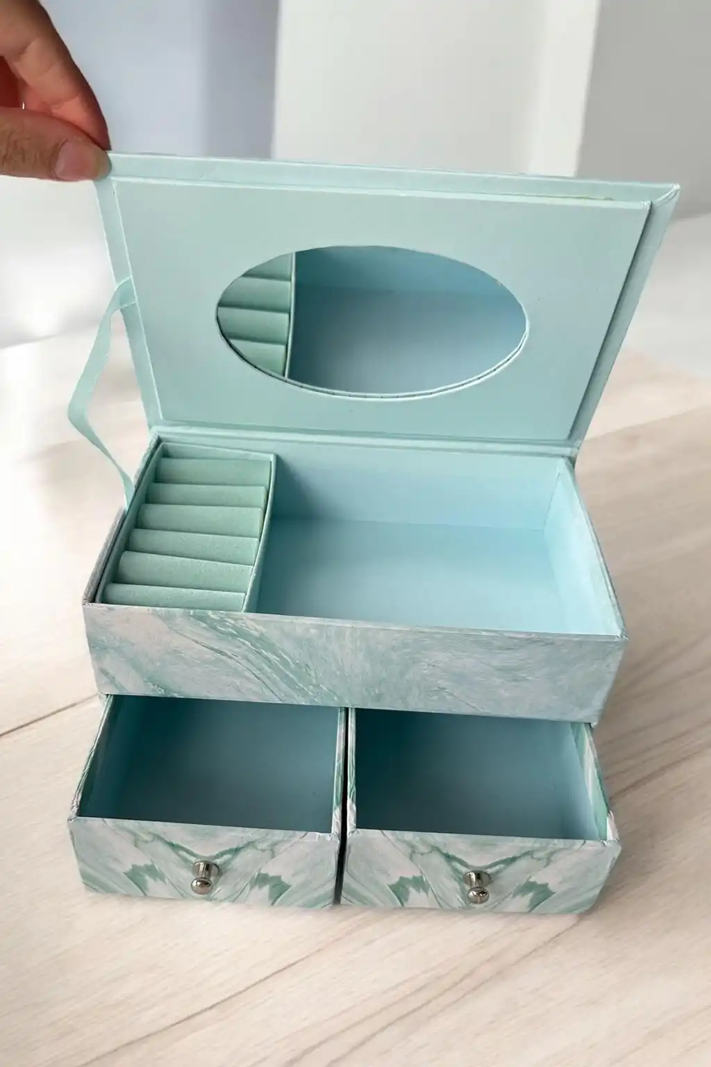 Mavi Renk Ayna Detaylı Bölmeli Çekmeceli Takı Organizeri