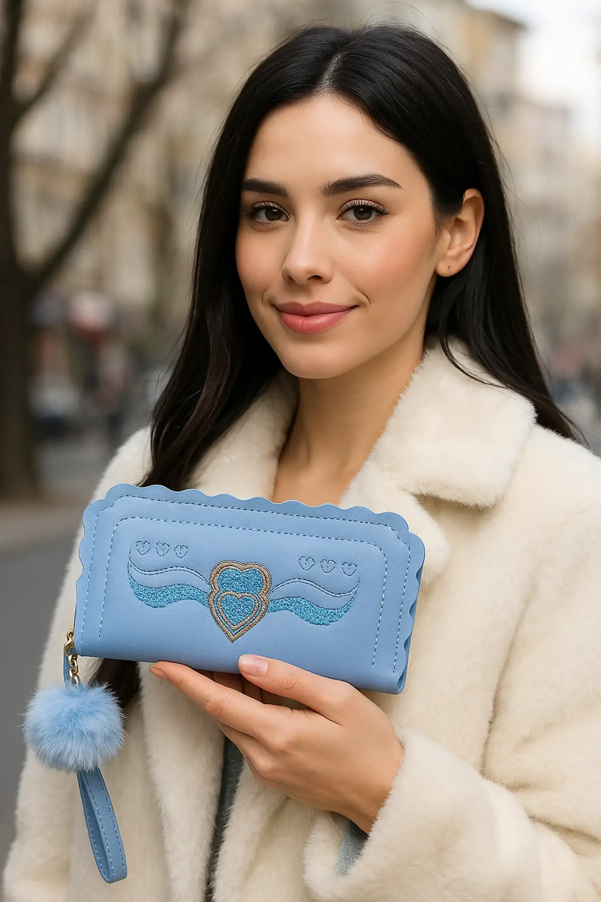 Mavi Renk Kalp Figürlü Ponpon Detaylı Kadın Deri Cüzdan
