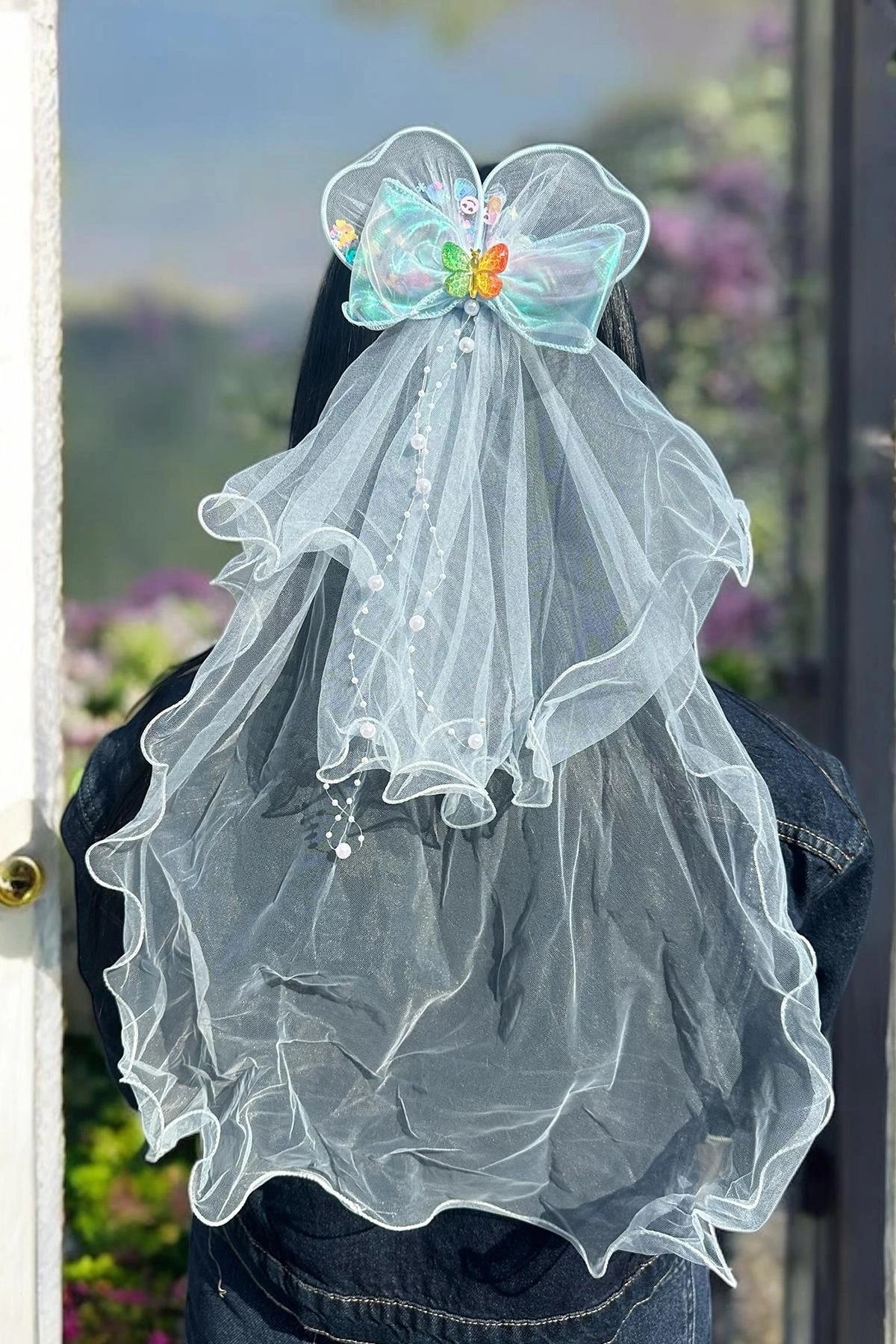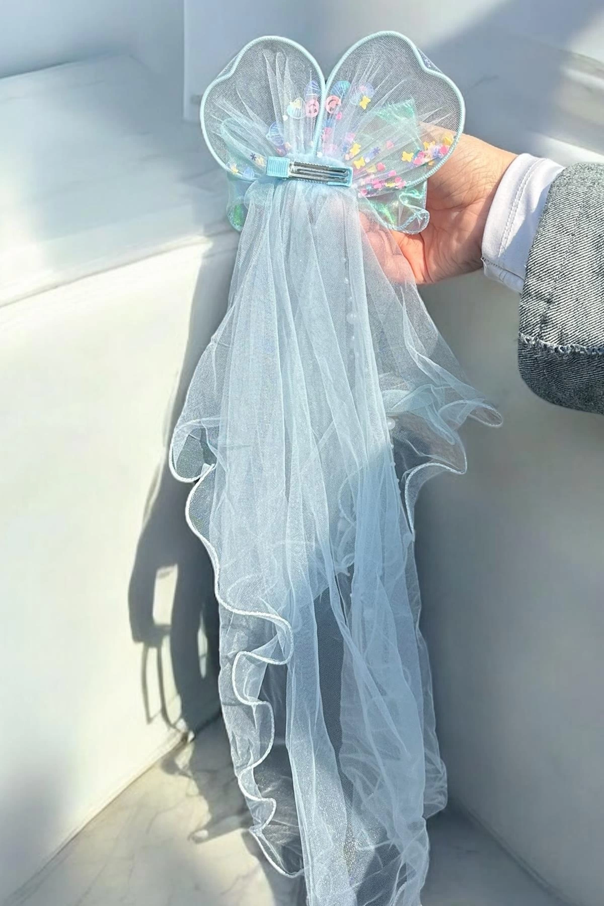 Mavi Renk Kurdele Figürlü Duvak Detaylı Yan Toka