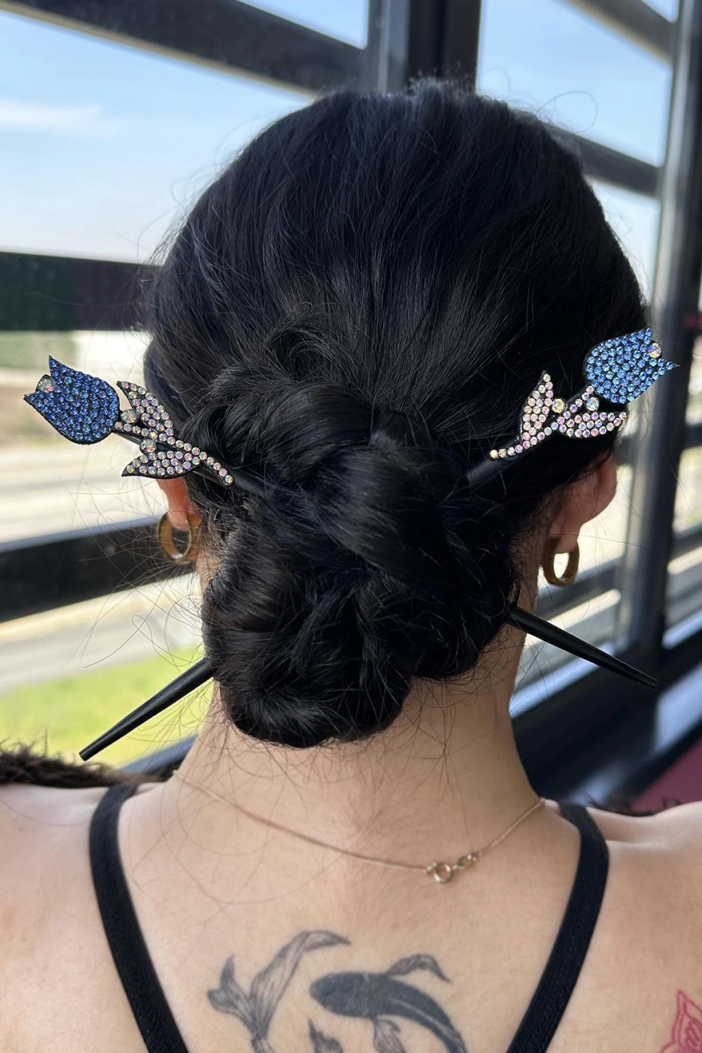 Mavi Renk Lale Figürlü Taş Detaylı Topuz Tokası/ Kalemi