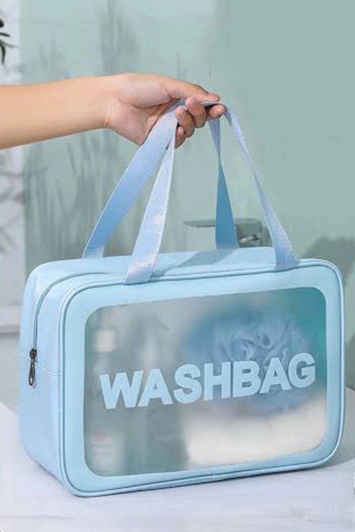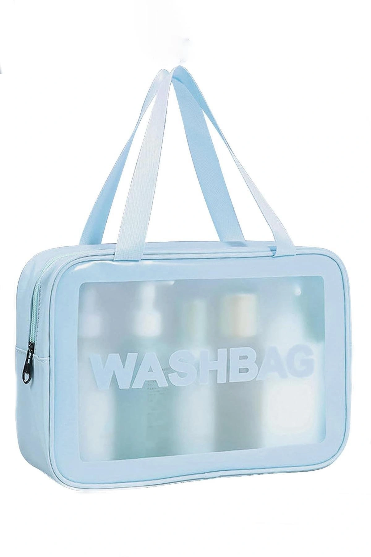 Mavi Renk Washbag Yazılı Su Geçirmez Büyük Boy Makyaj Çantası