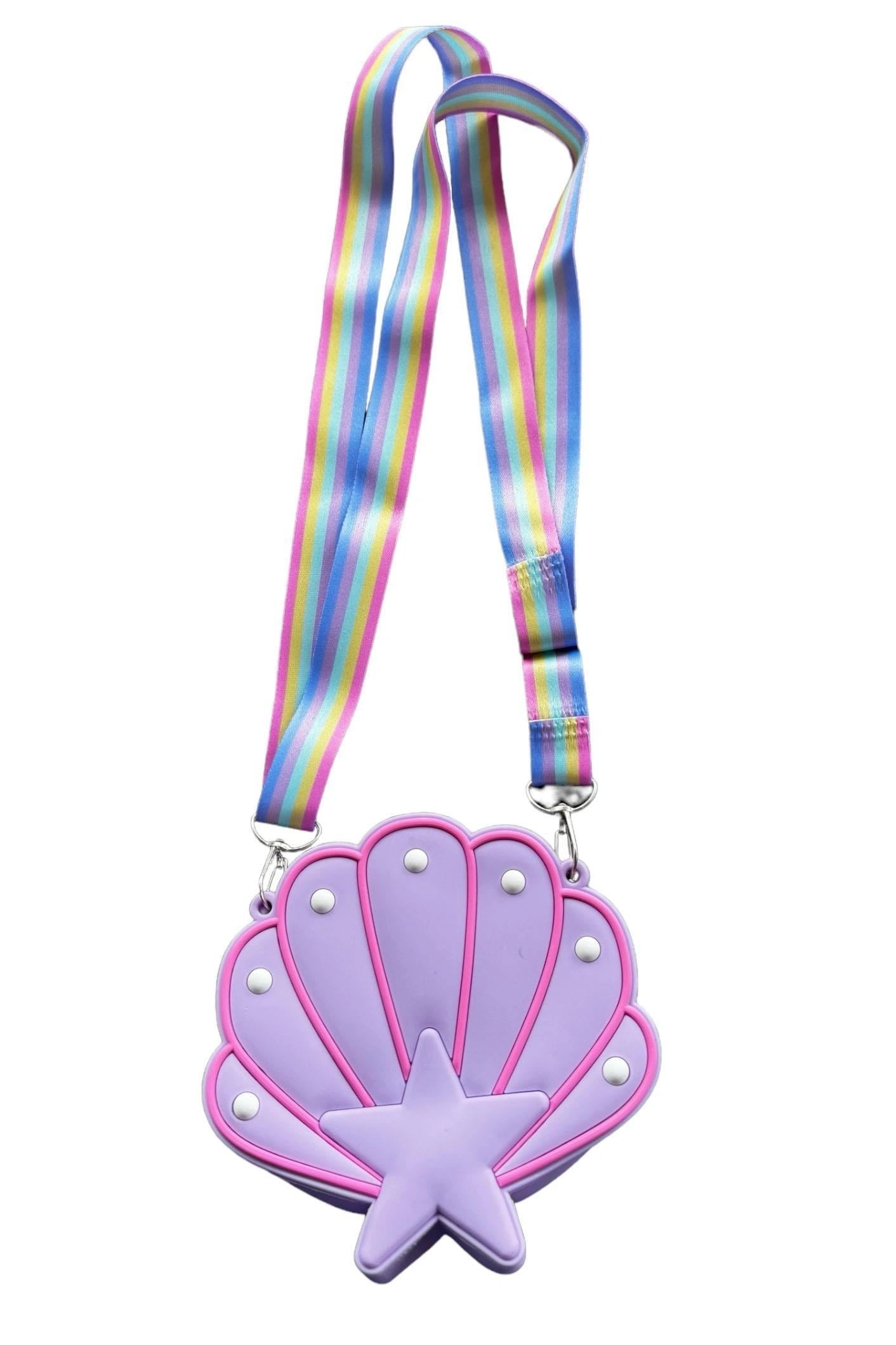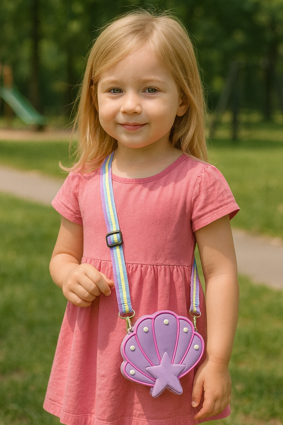 Yumuşak silikon malzemeden üretilen bu pembe deniz kabuğu çantası, hem şık hem de dayanıklı yapısıyla çocukların favorisi olacak.
