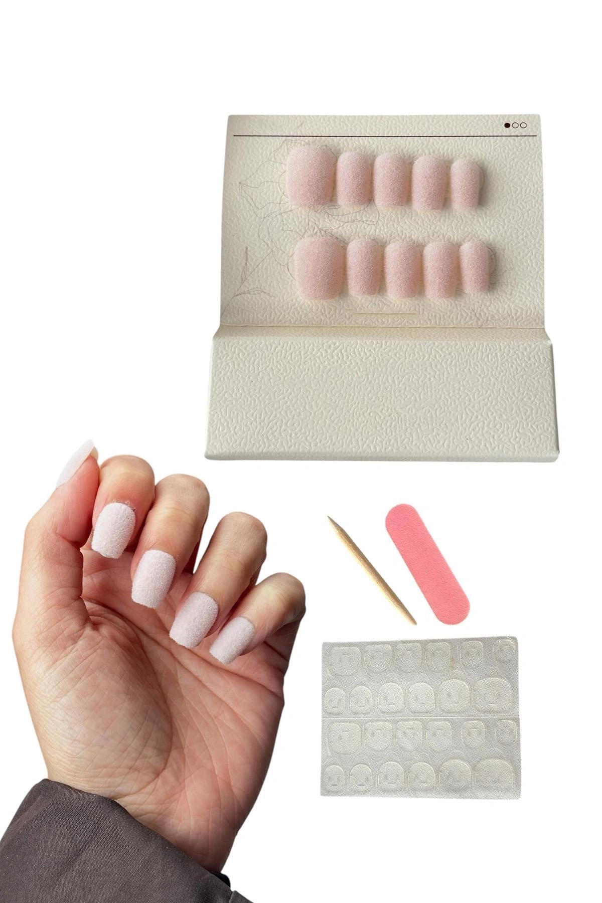 Kutu içerisinde kendinden yapışkanlı şeffaf tırnak yapıştırıcısı mevcuttur.