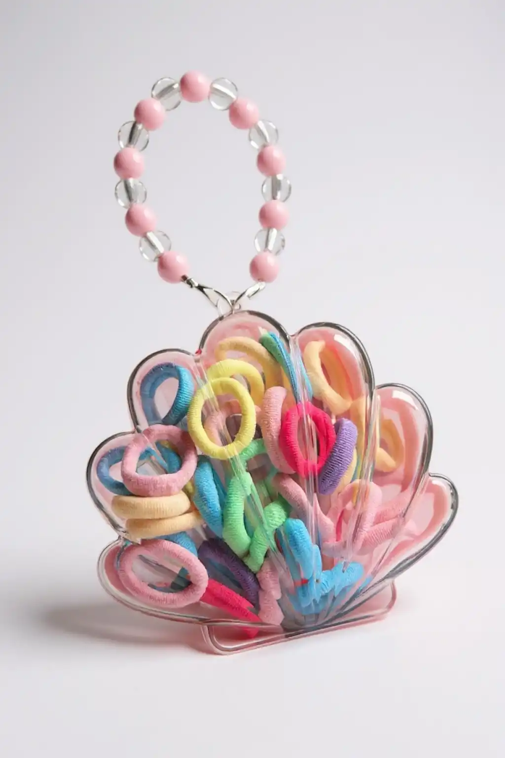 Miniklere özel hazırlanan bu renkli çocuk tokası seti, sevimli çanta tasarımıyla hem kullanışlı hem de eğlenceli! Şeffaf deniz kabuğu formundaki mini çantanın içinde, yumuşak dokulu ve saçlara zarar vermeyen çoklu renkli mini lastik tokalar bulunur.