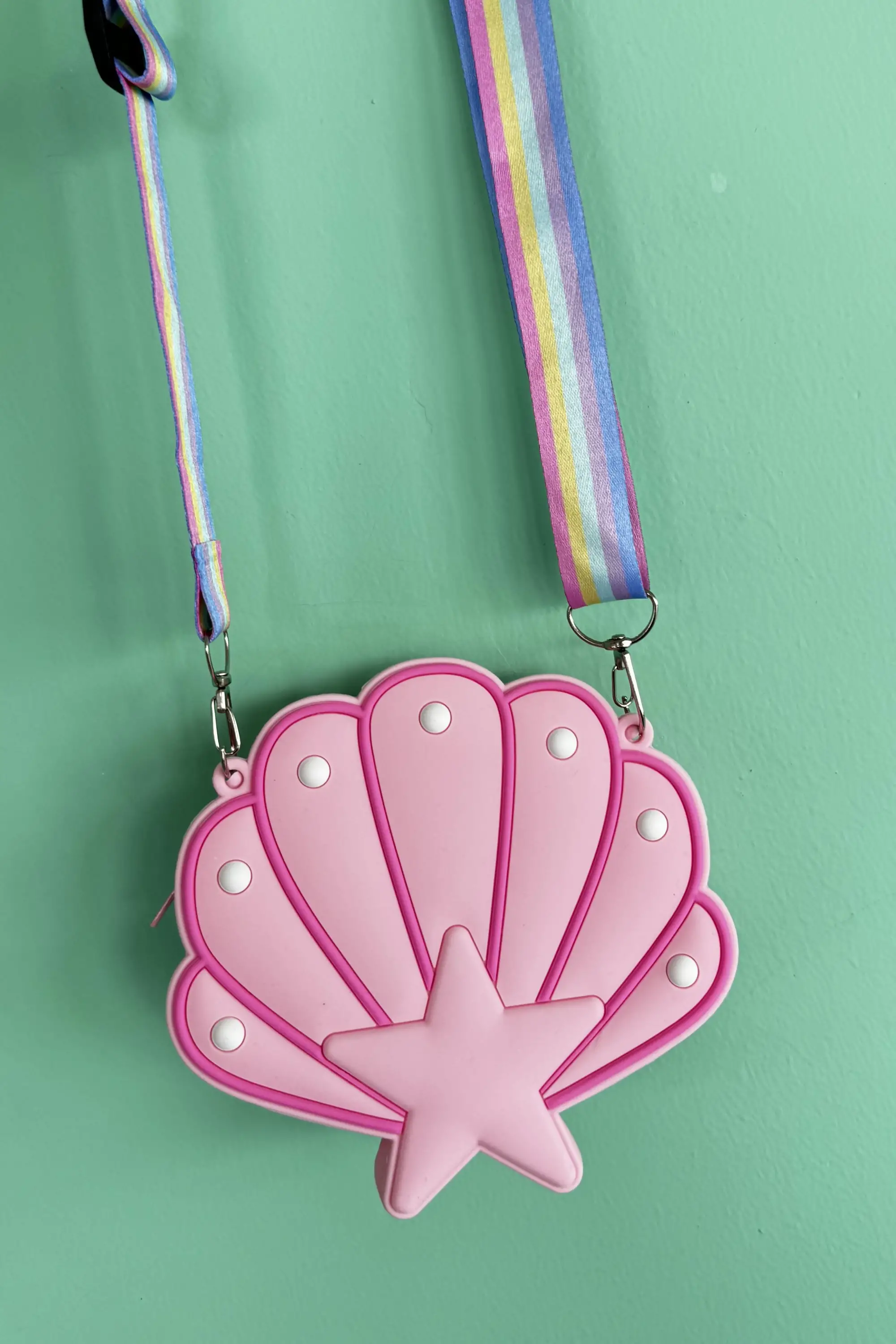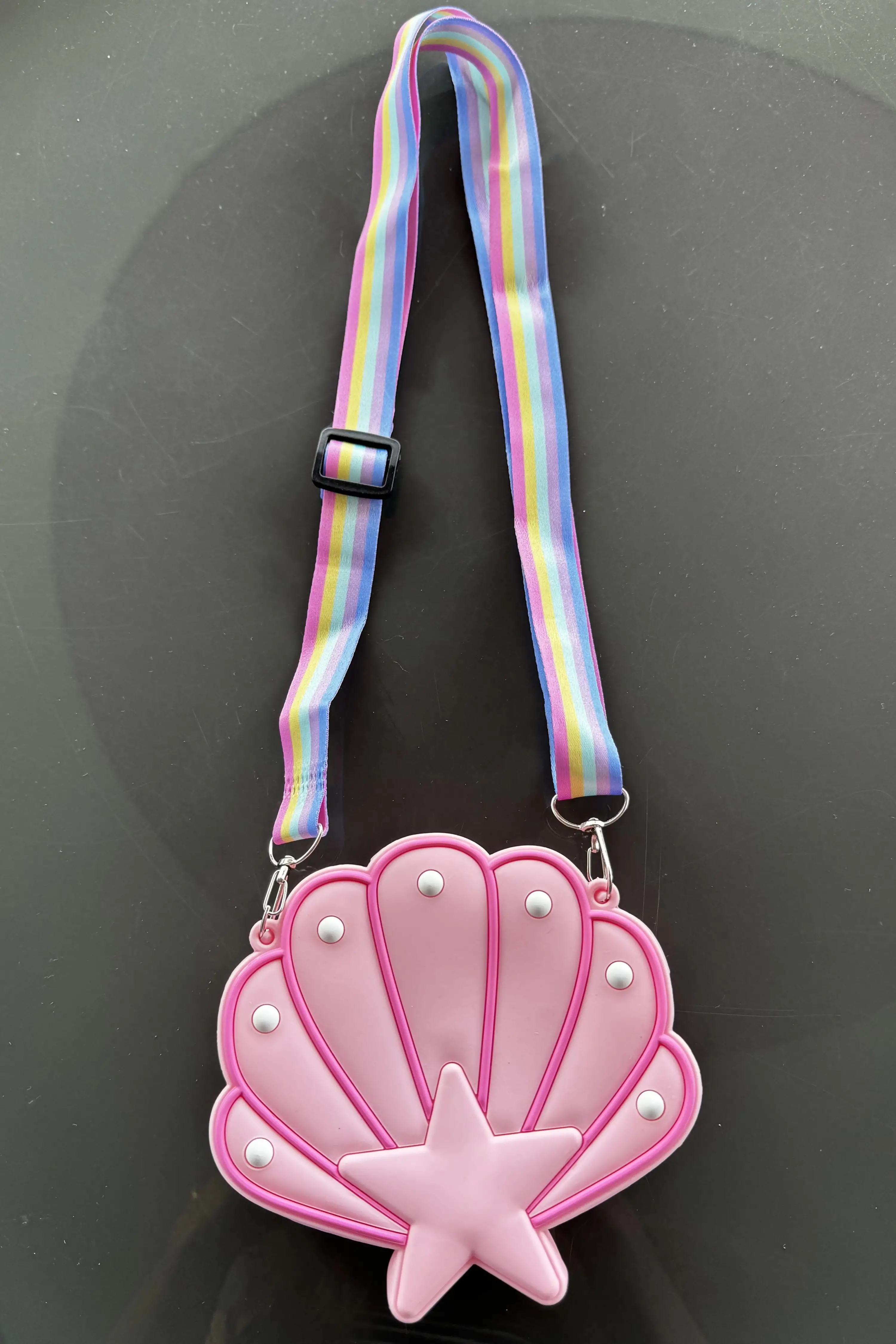 Yumuşak silikon malzemeden üretilen bu pembe deniz kabuğu çantası, hem şık hem de dayanıklı yapısıyla çocukların favorisi olacak.