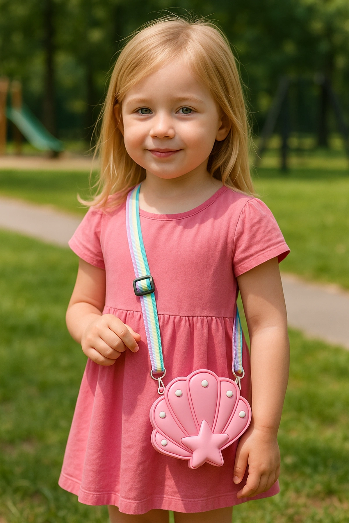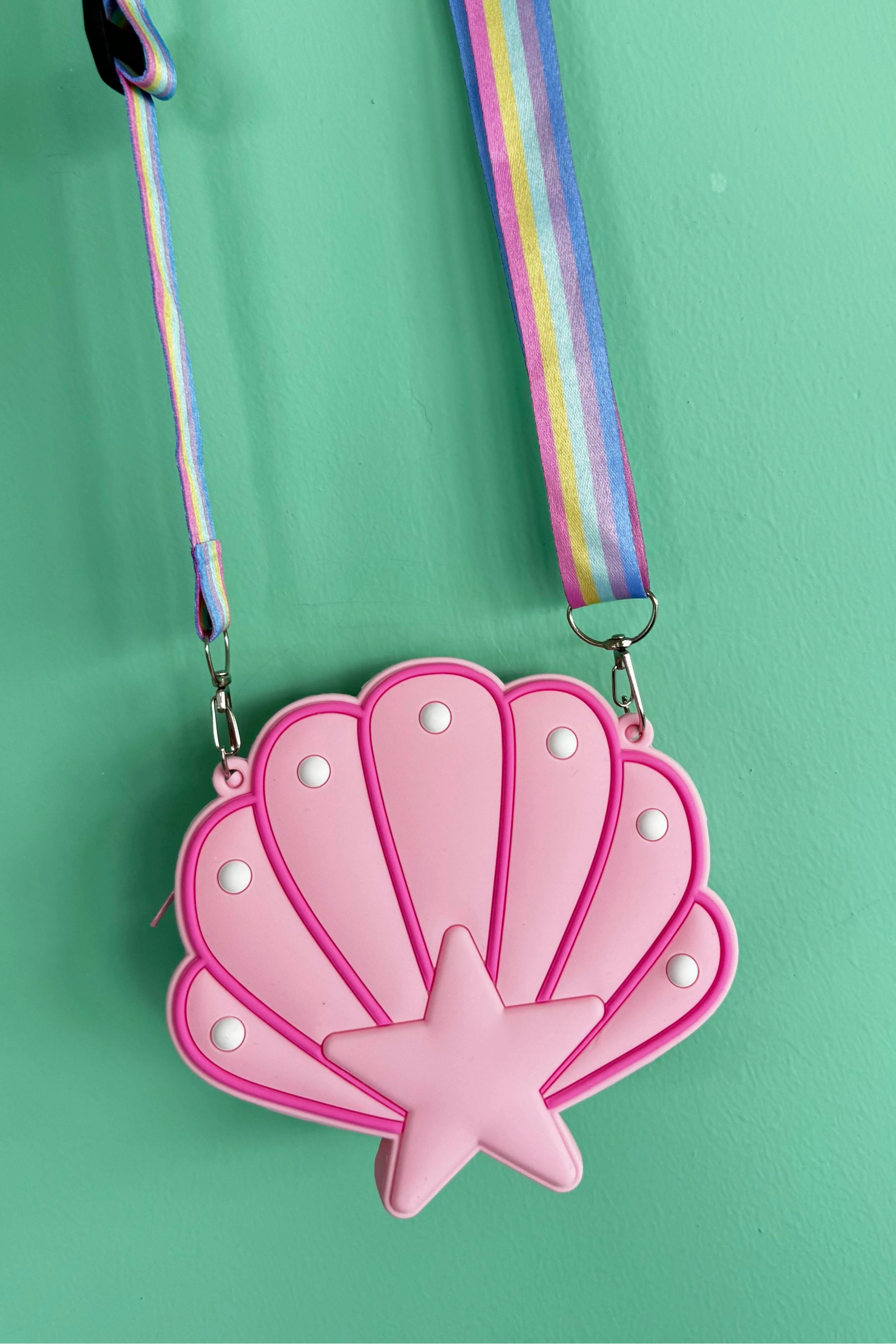Yumuşak silikon malzemeden üretilen bu pembe deniz kabuğu çantası, hem şık hem de dayanıklı yapısıyla çocukların favorisi olacak.