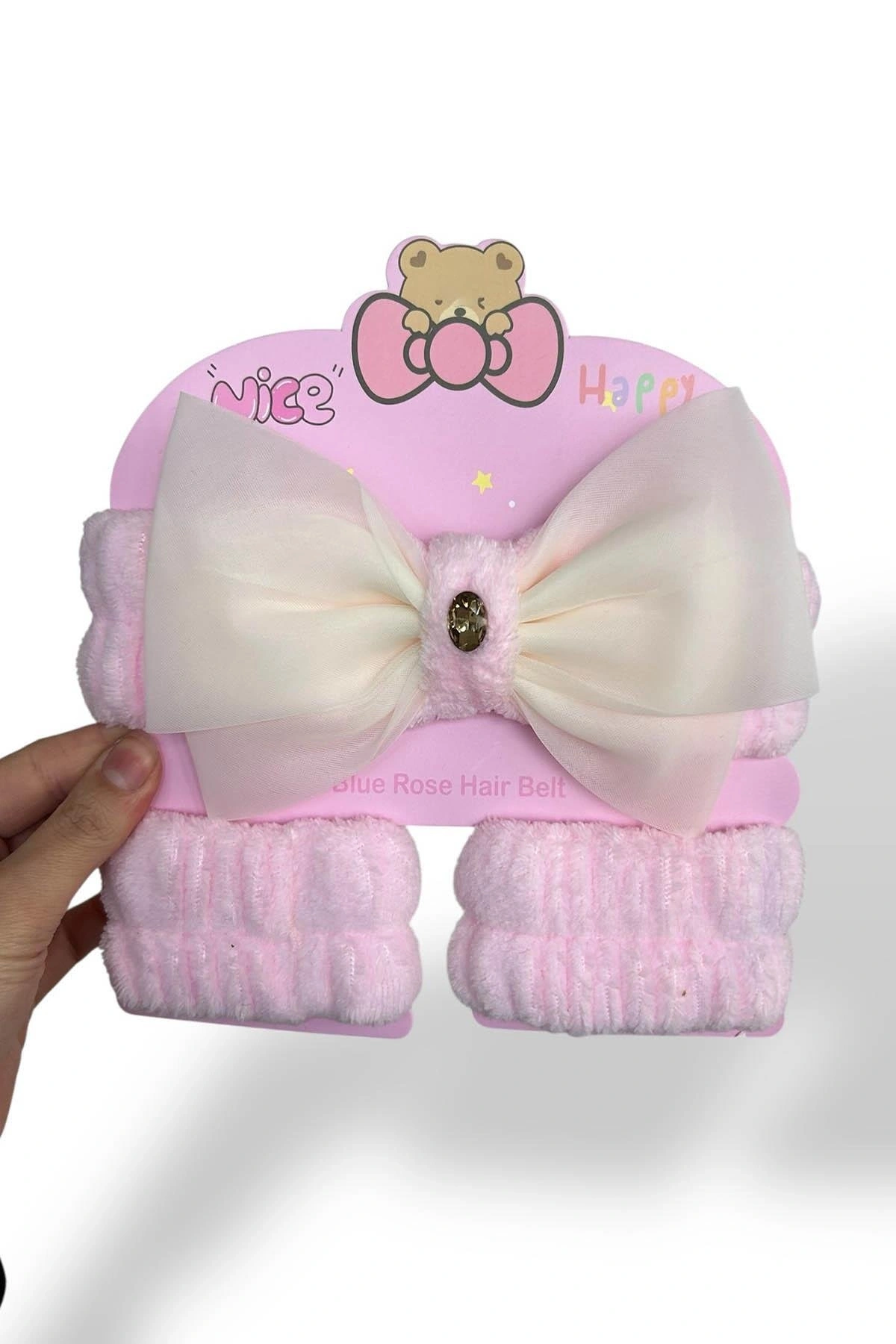 Pembe Renk Fiyonk Detaylı Su Emici Havlu Bileklik Saç Bandı