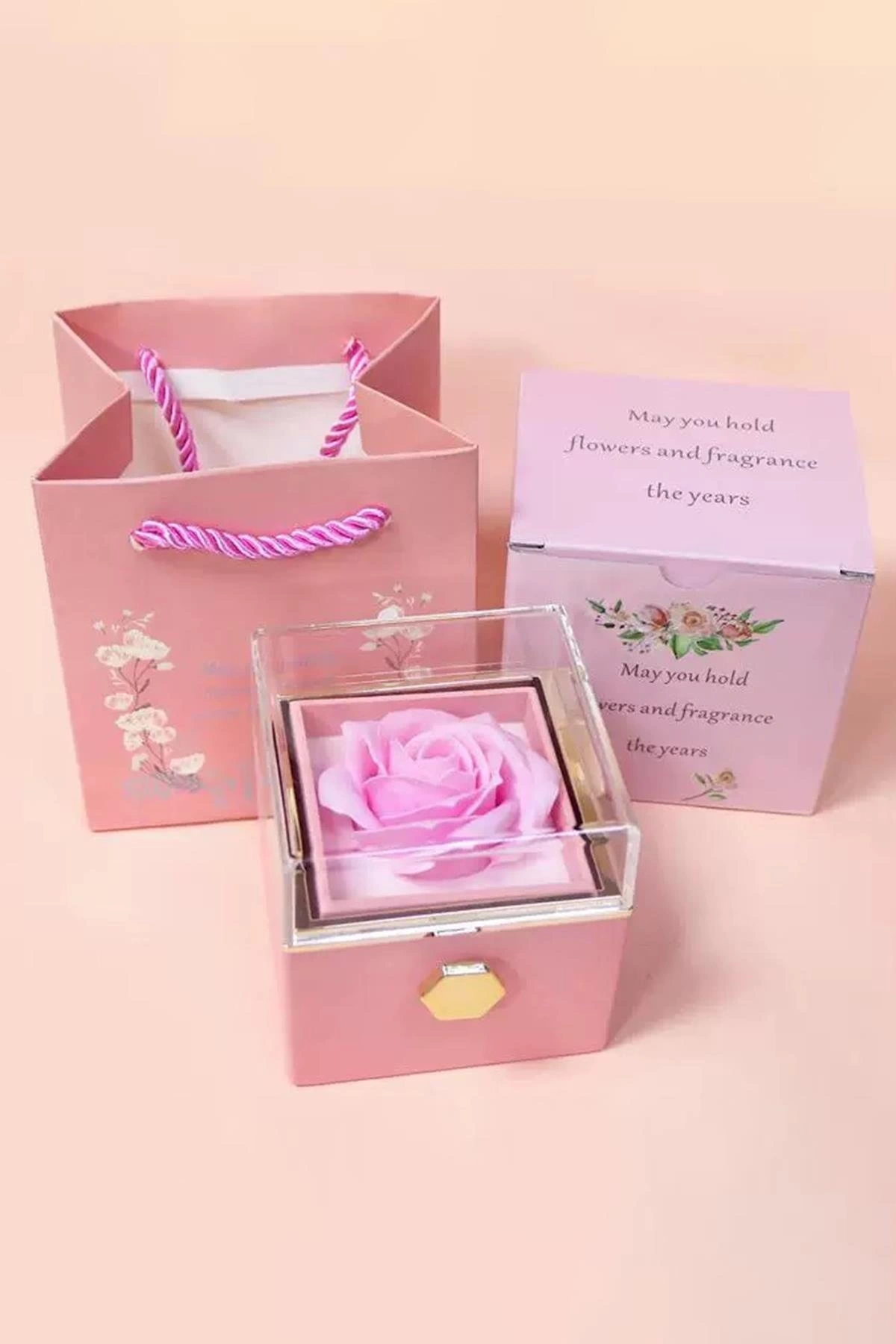 Pembe Renk Gül Figürlü Karton Çanta Hediyeli Hediye Kutusu