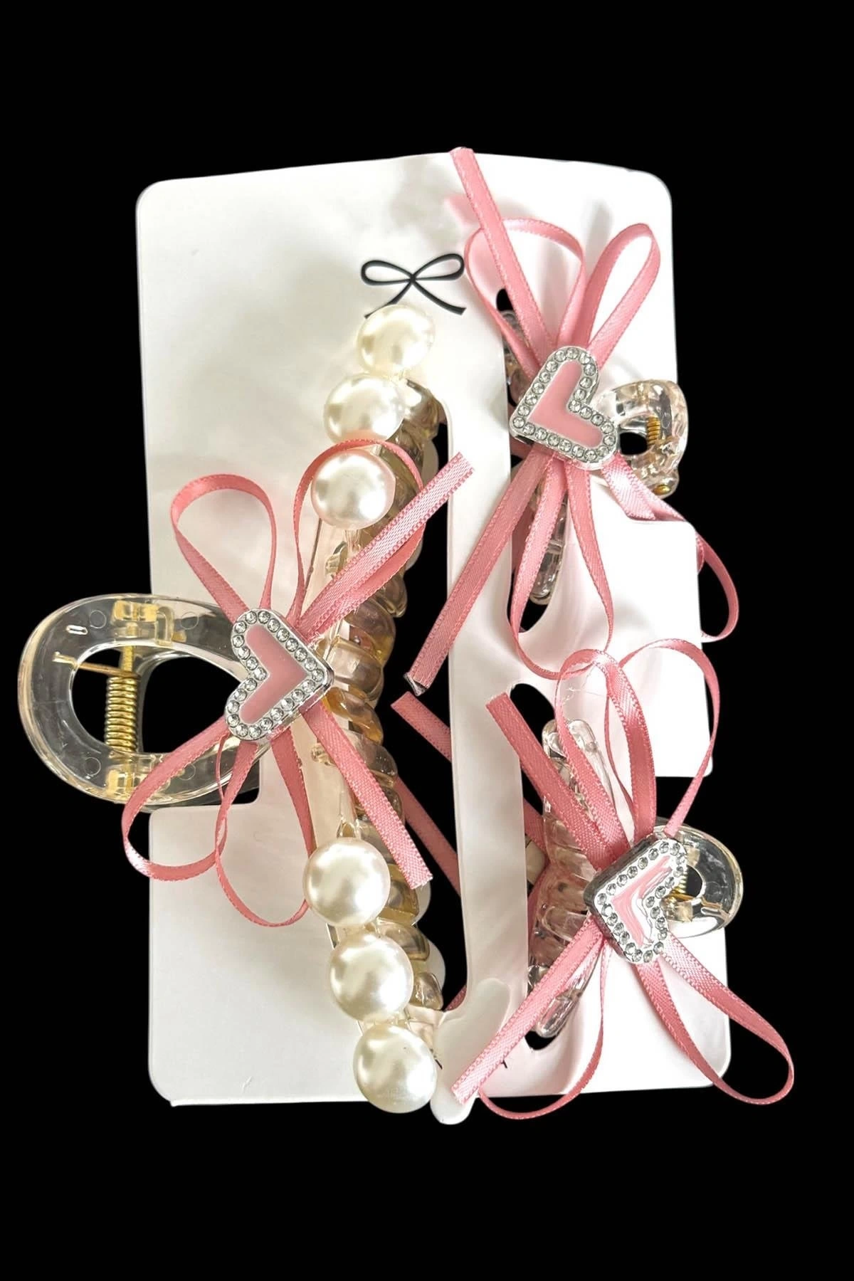 Pembe Renk Kalp Figürlü İnci Detaylı 3'lü Mandal Toka Set