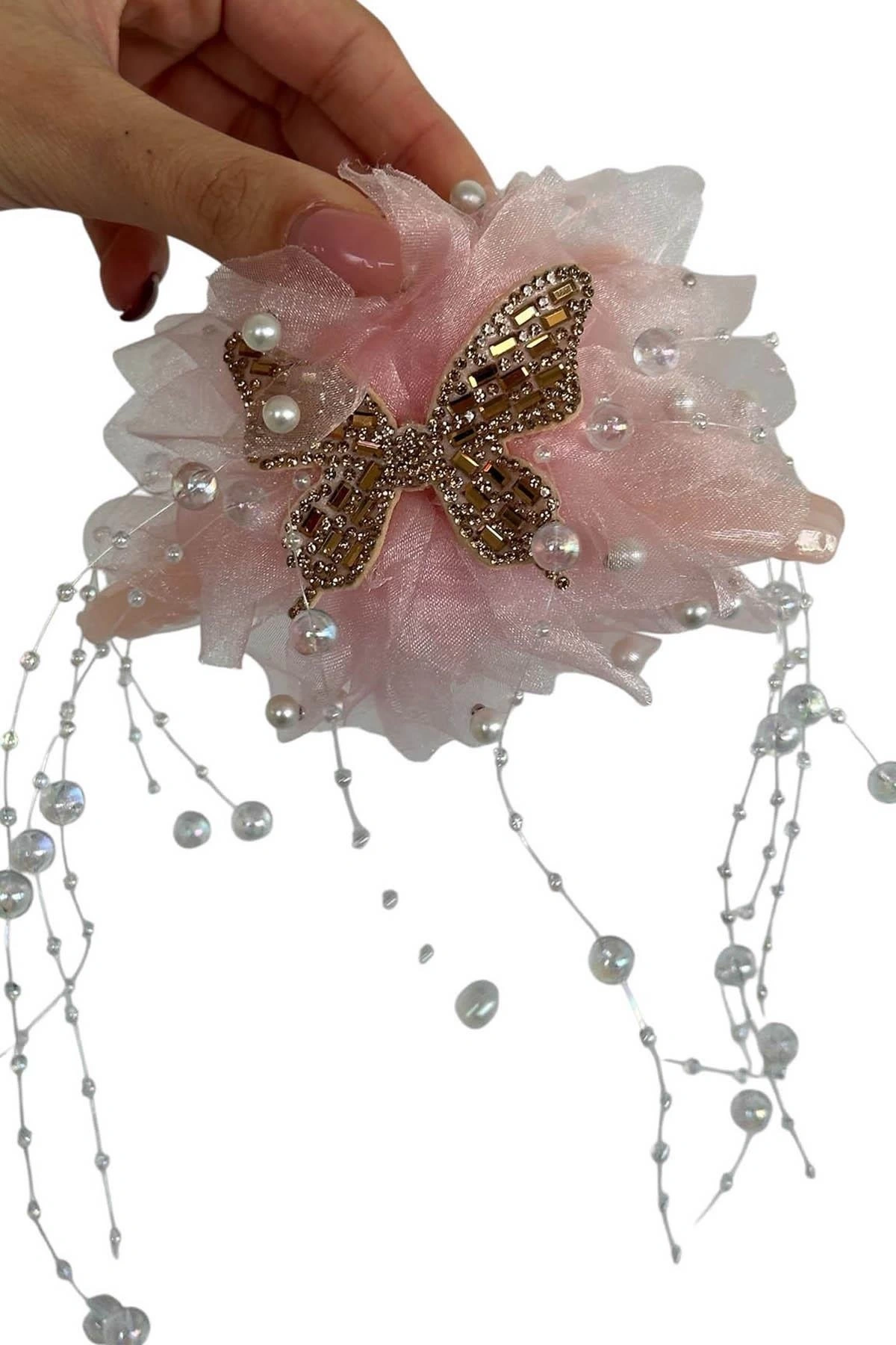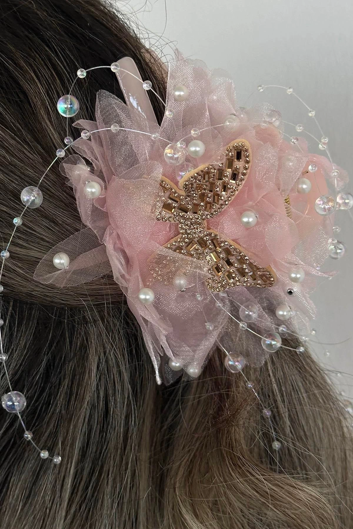Pembe Renk Kelebek Figürlü İnci Detaylı Mandal Toka