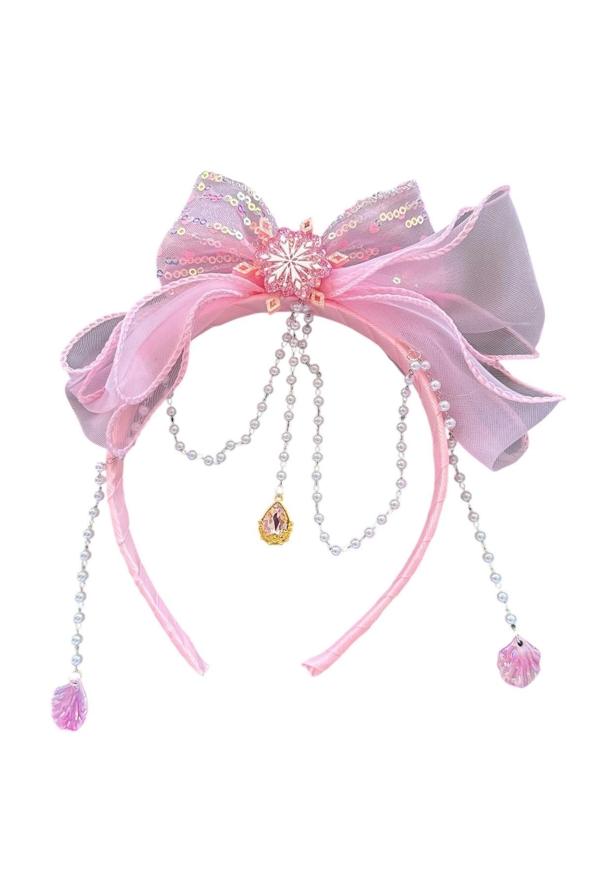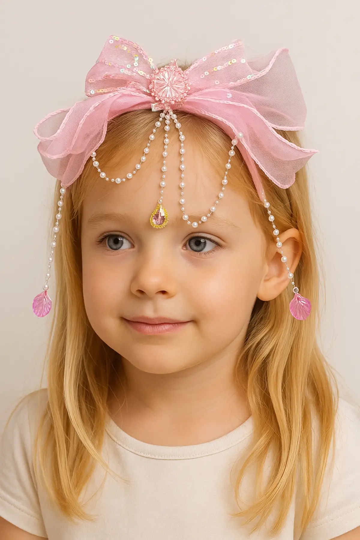 Pembe Renk Kurdele Figürlü İnci Detaylı Çocuk Taç