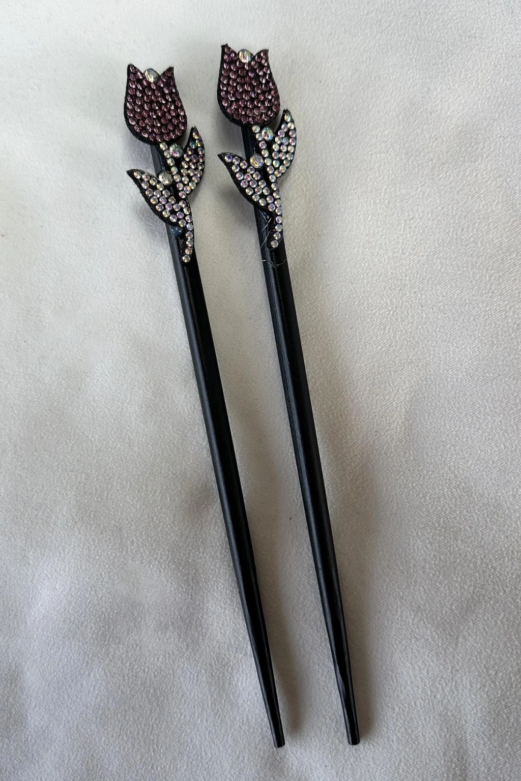 Pembe Renk Lale Figürlü Taş Detaylı İkili Topuz Tokası/ Kalemi