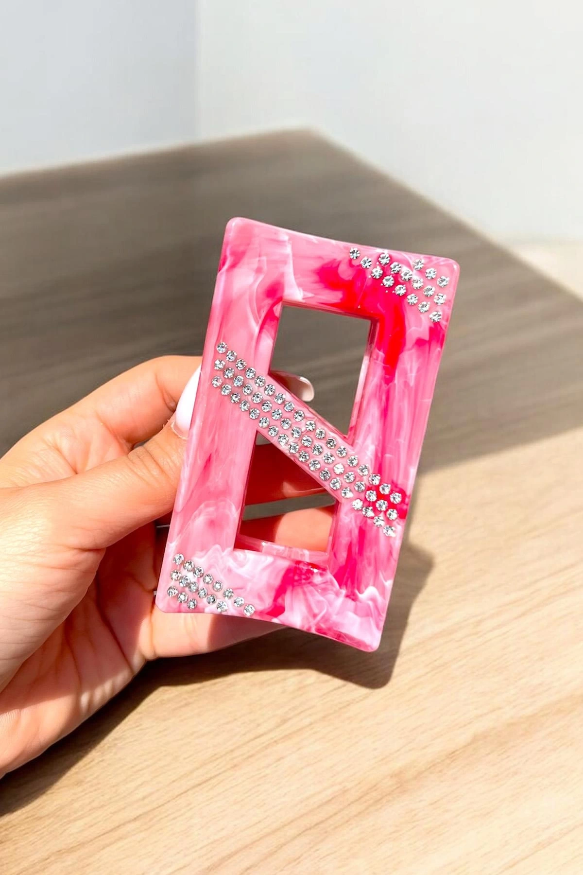 Pembe Renk Mermer Desenli Taş Detaylı Kemik Mandal Toka