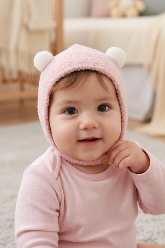Pembe Renk Ponpon Detaylı Bebek Peluş Şapka