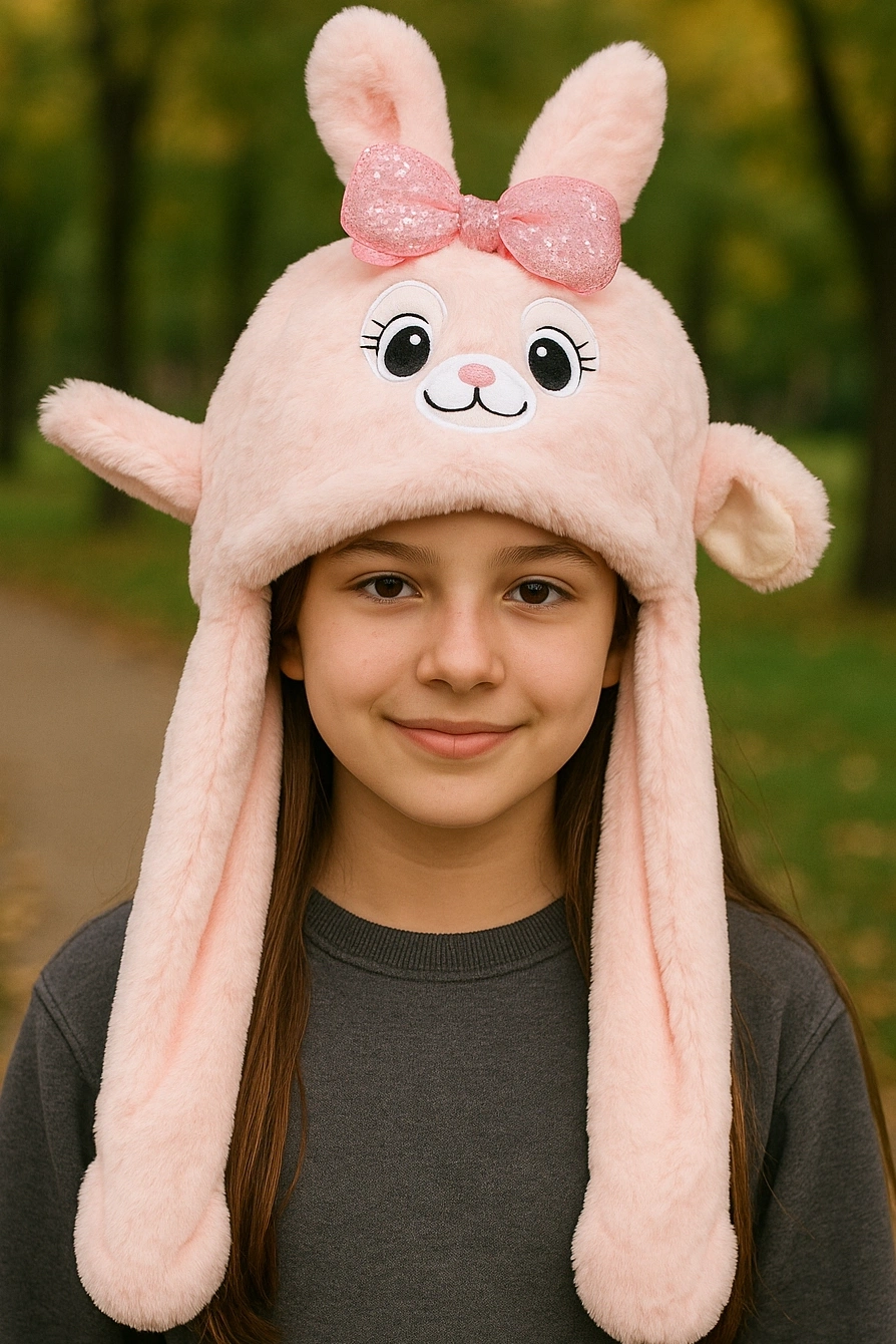 Pembe Renk Tavşan Figürlü Kulakları Oynayan Peluş Şapka