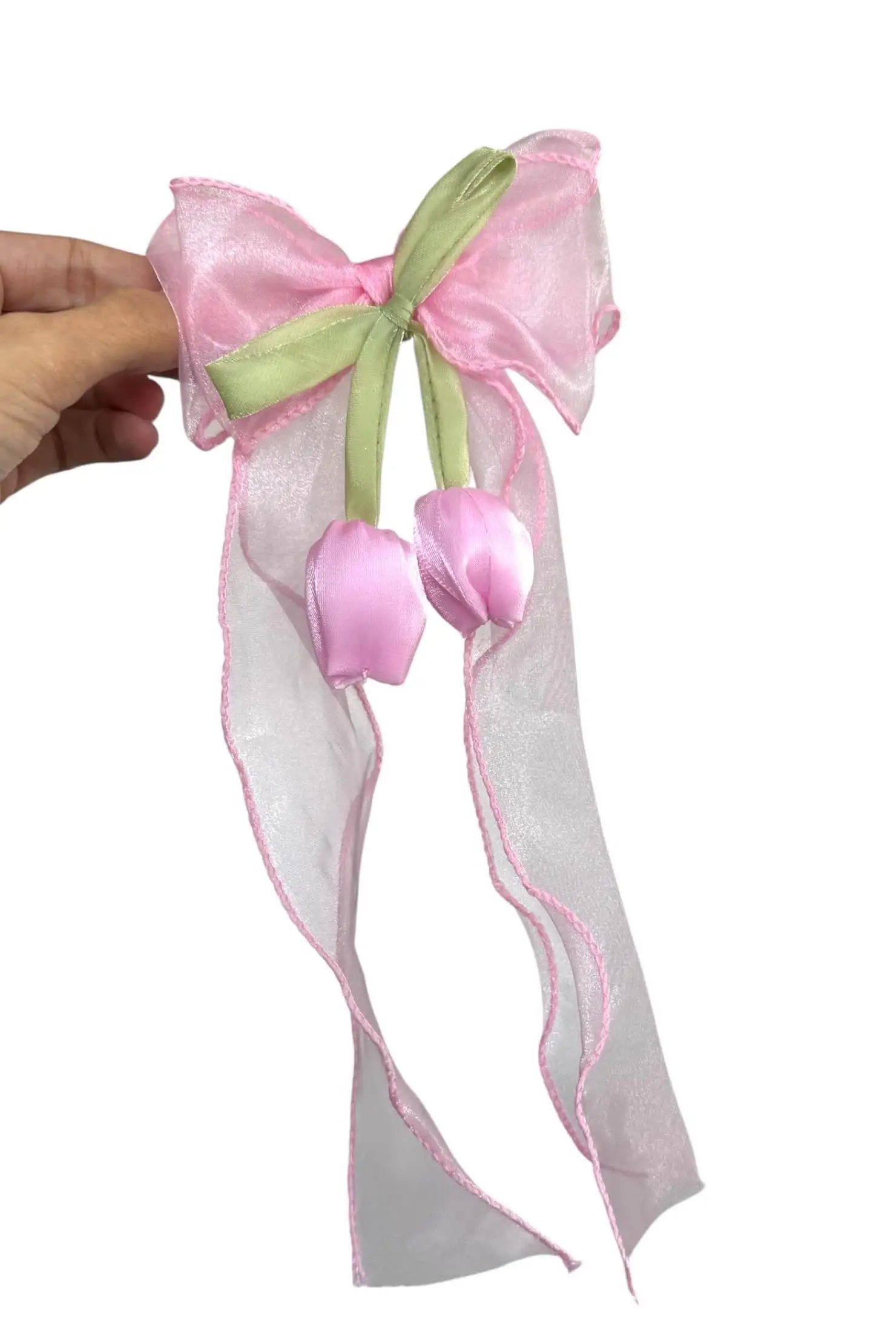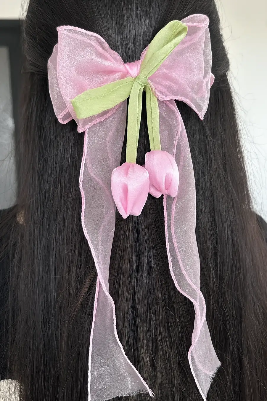 Pembe Ve Yeşil Renk Kurdele Detaylı Lale Figürlü Otomat Toka