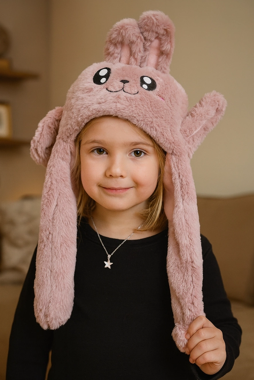 Pudra Renk Tavşan Figürlü Kulakları Oynayan Peluş Şapka