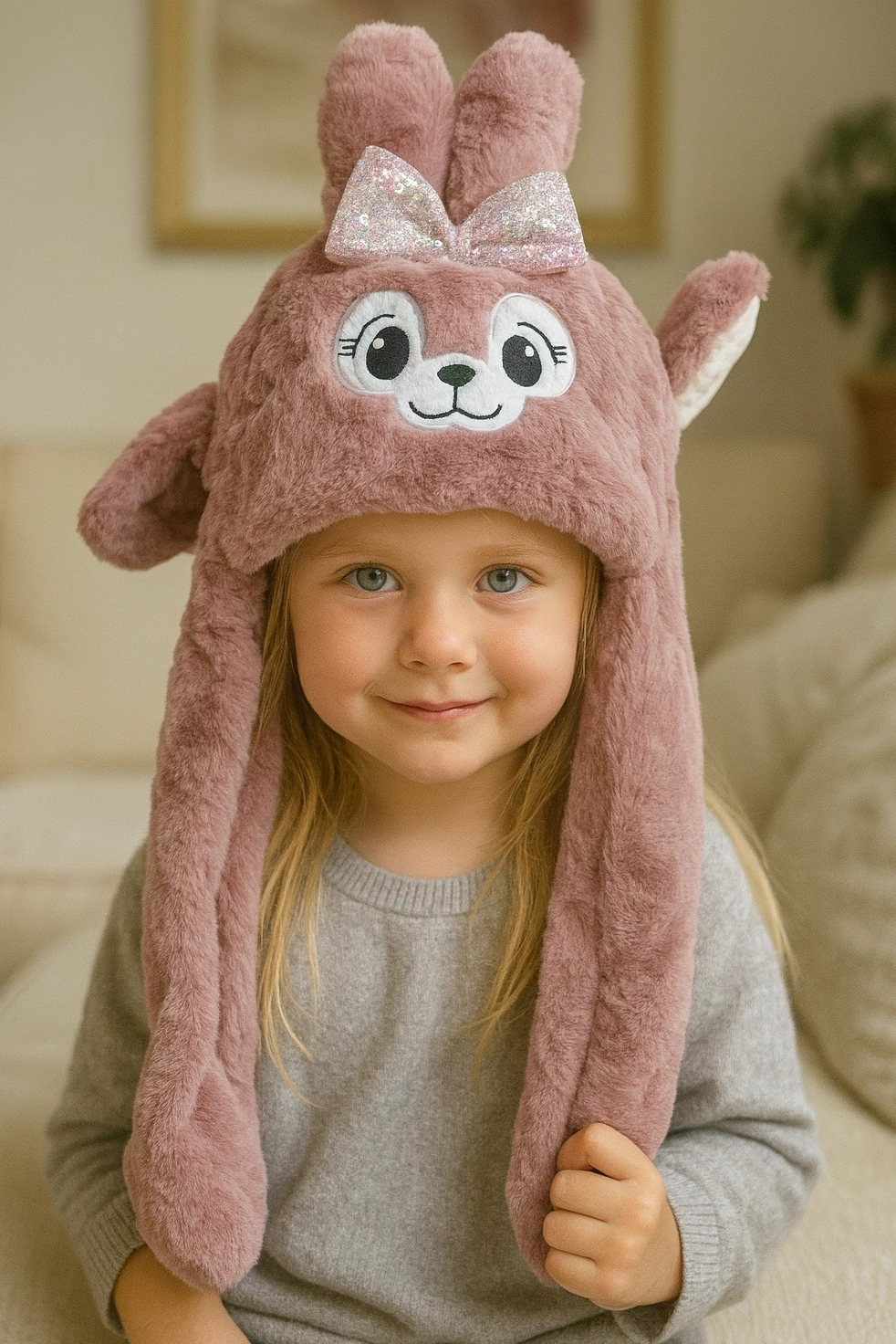 Pudra Renk Tavşan Figürlü Kulakları Oynayan Peluş Şapka