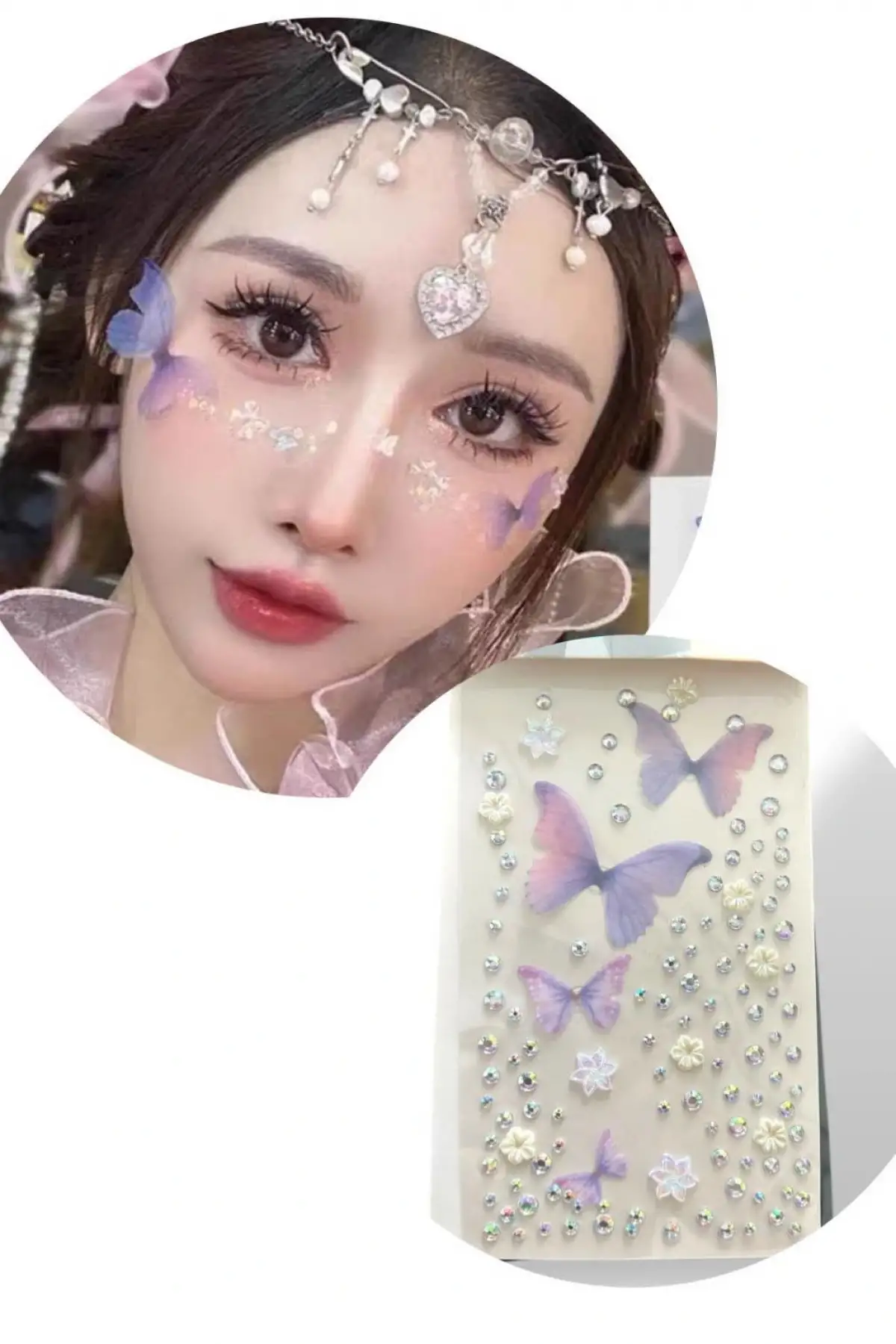 Mor Renk Kelebek Figürlü Taş Detaylı Yüz Taşı/ Yapışkanlı Taşlı Yüz Sticker